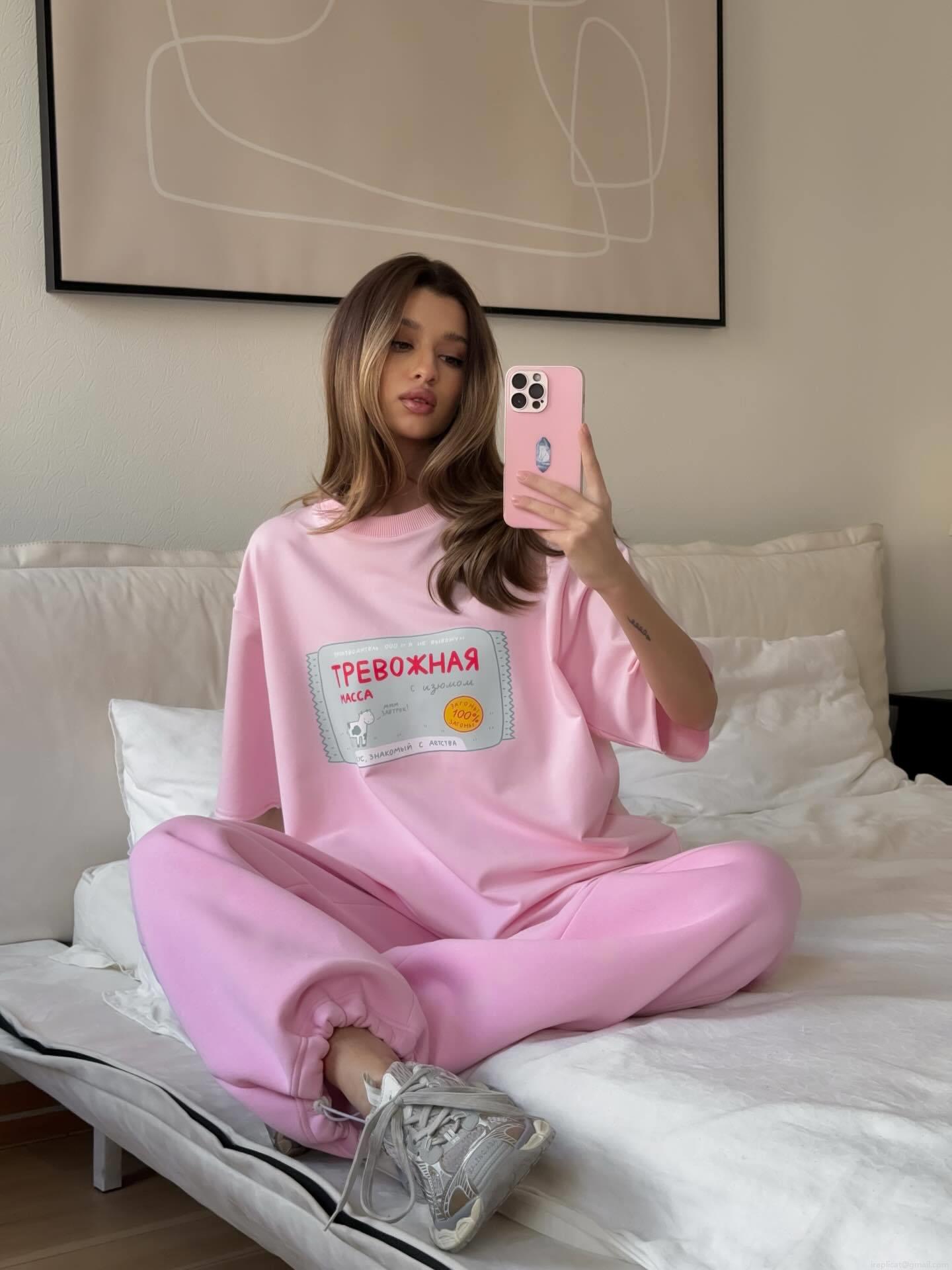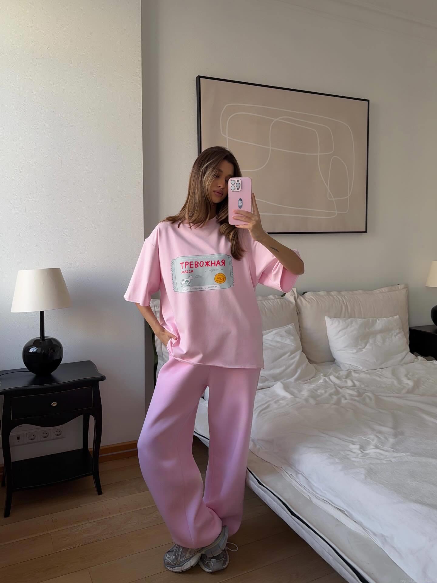 Women's Pink Cotton Graphic T-Shirt Loose Drop Shoulder Short Sleeve Top Casual Russian Style Milk Label Print Comfortable Streetwear For Summer Daily