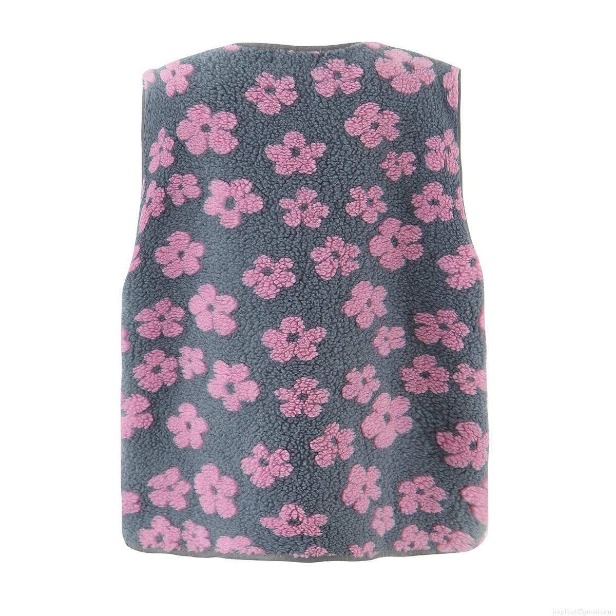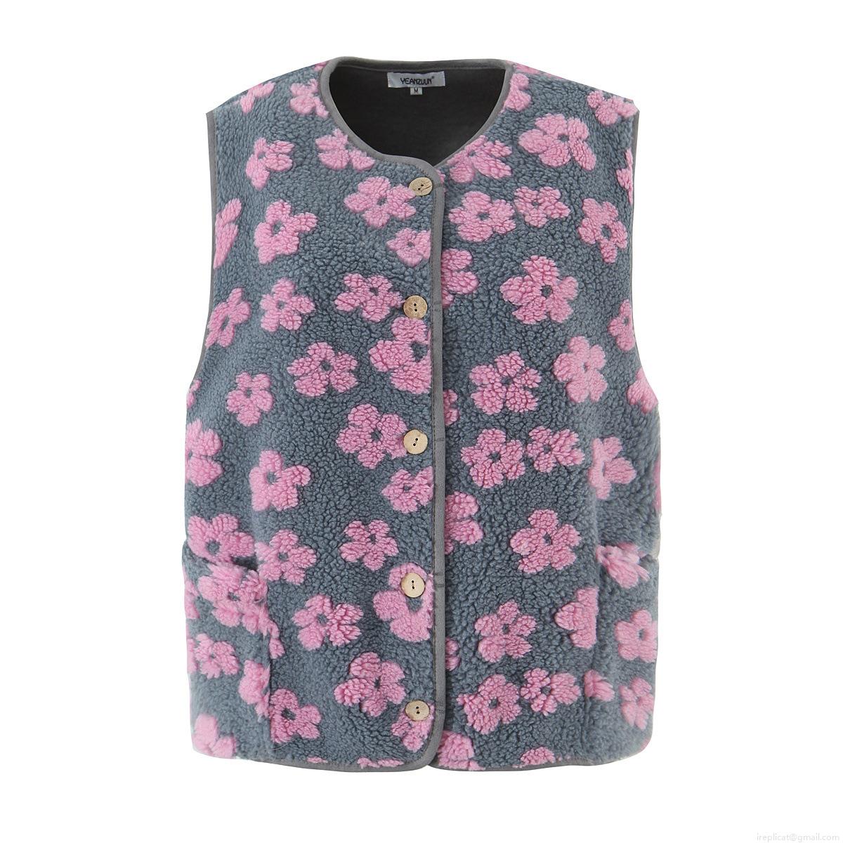 Women's Polar Fleece Floral Vest Round Neck Sleeveless Lamb Wool Jacket Casual Warm Outerwear Waistcoat With Wood Buttons Pockets For Autumn Winter