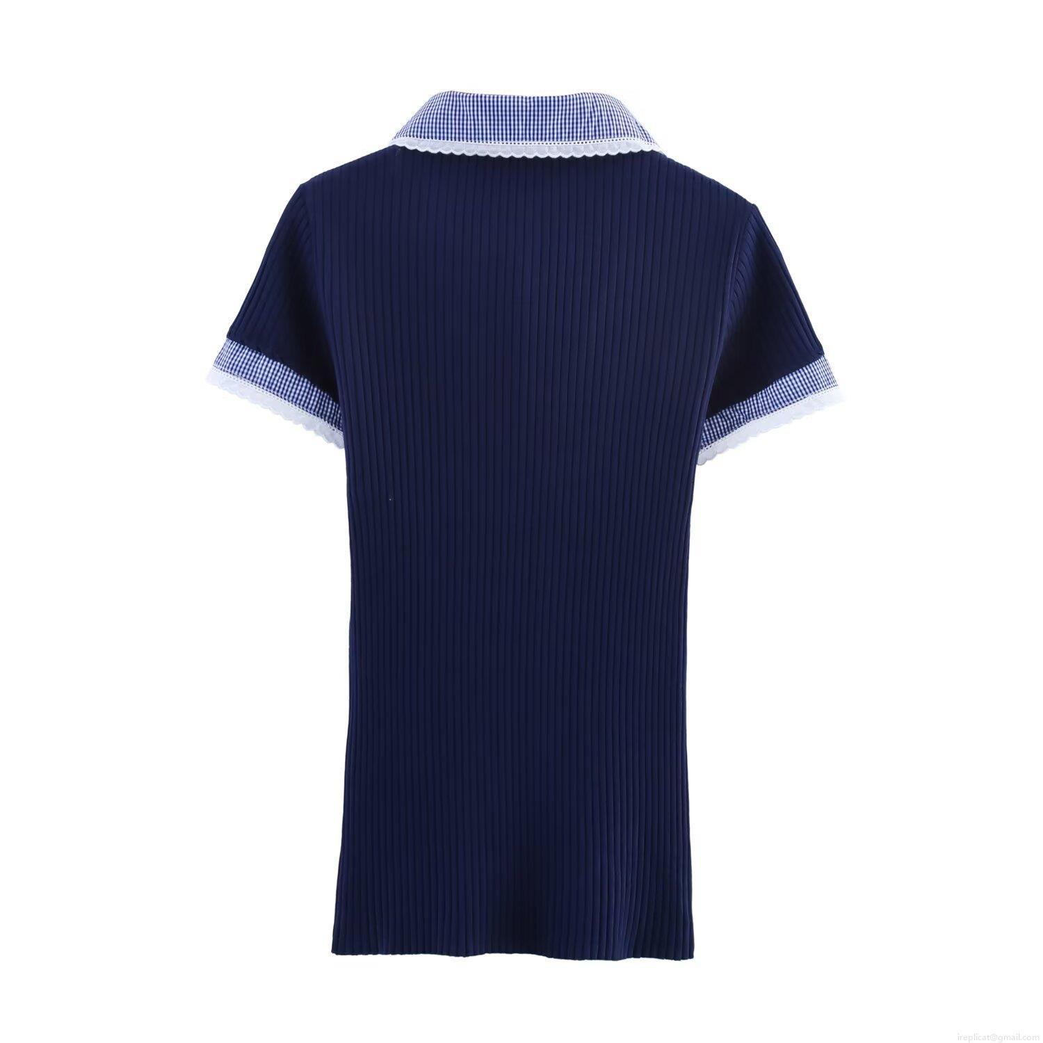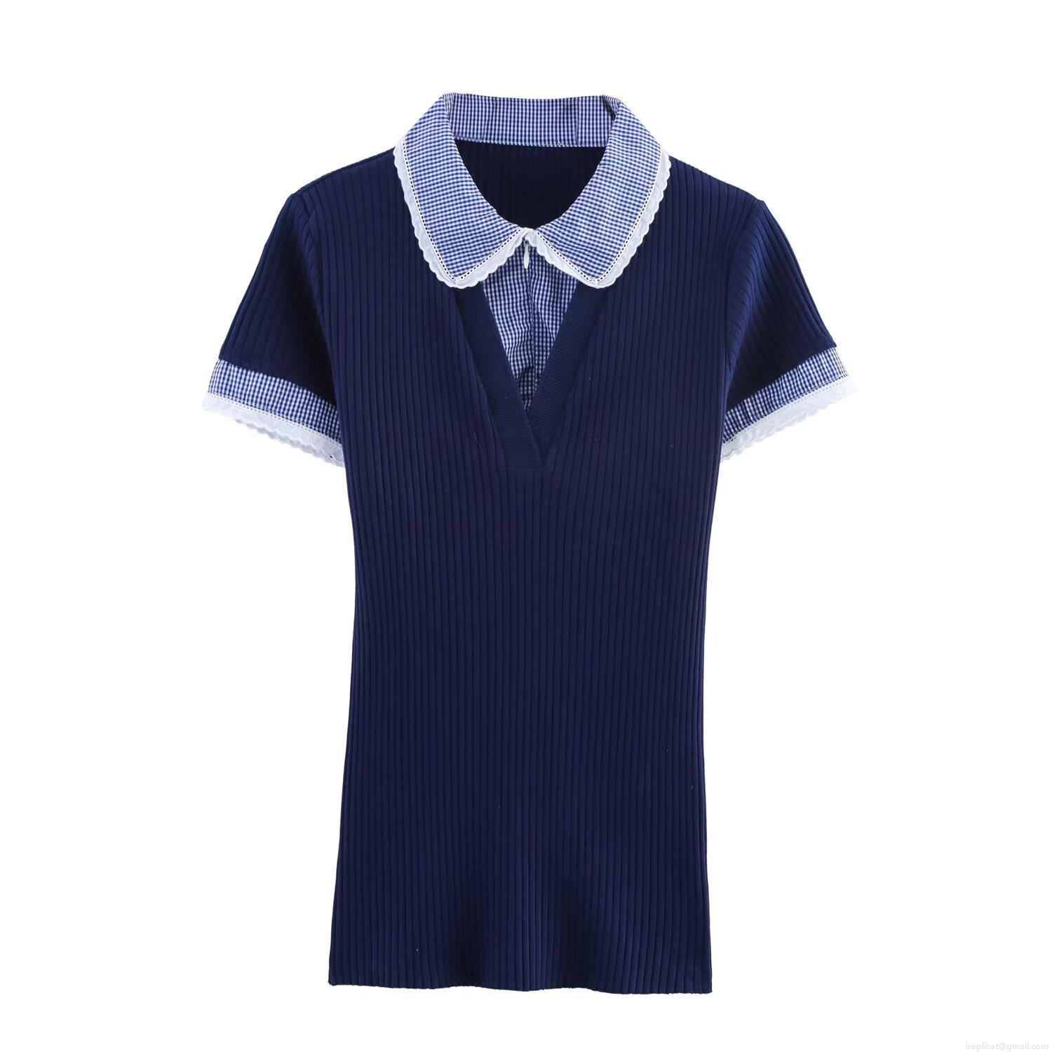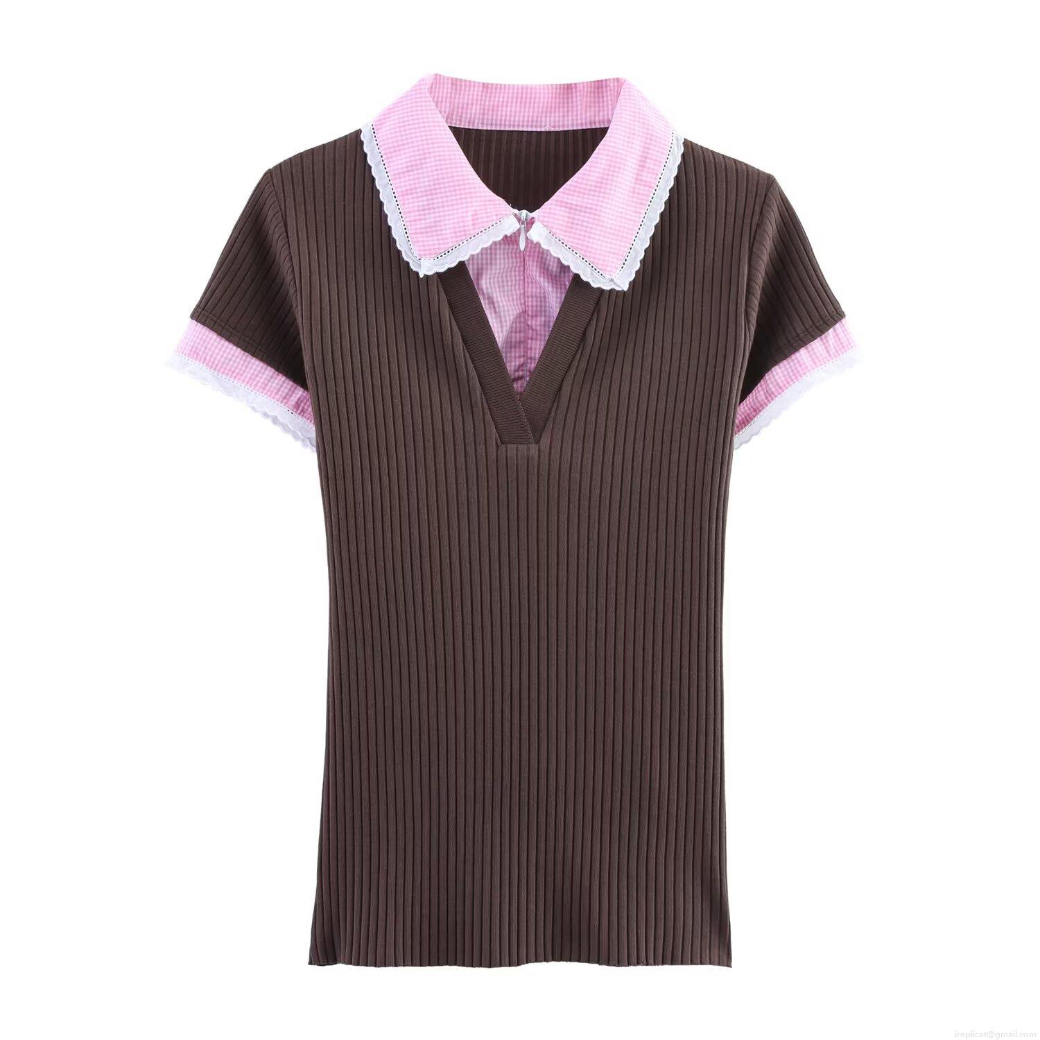 Women's Polo Collar Short Sleeve Ribbed Knit T-Shirt Plaid Patchwork V-Neck Top With Lace Trim Casual Summer Streetwear Tee