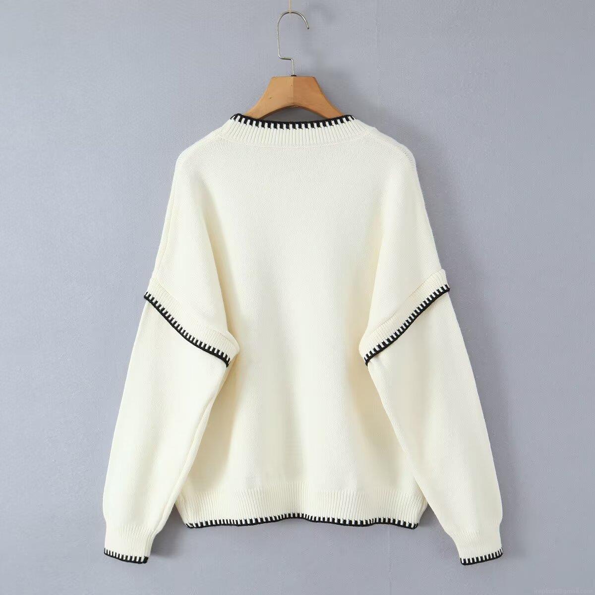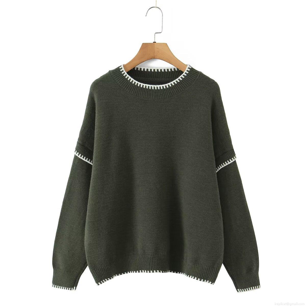 Women's Polyester Knit Sweater Contrast Stitch Round Neck Loose Casual Long Sleeve Pullover Jumper Minimalist Fashionable Soft Knitwear Tops