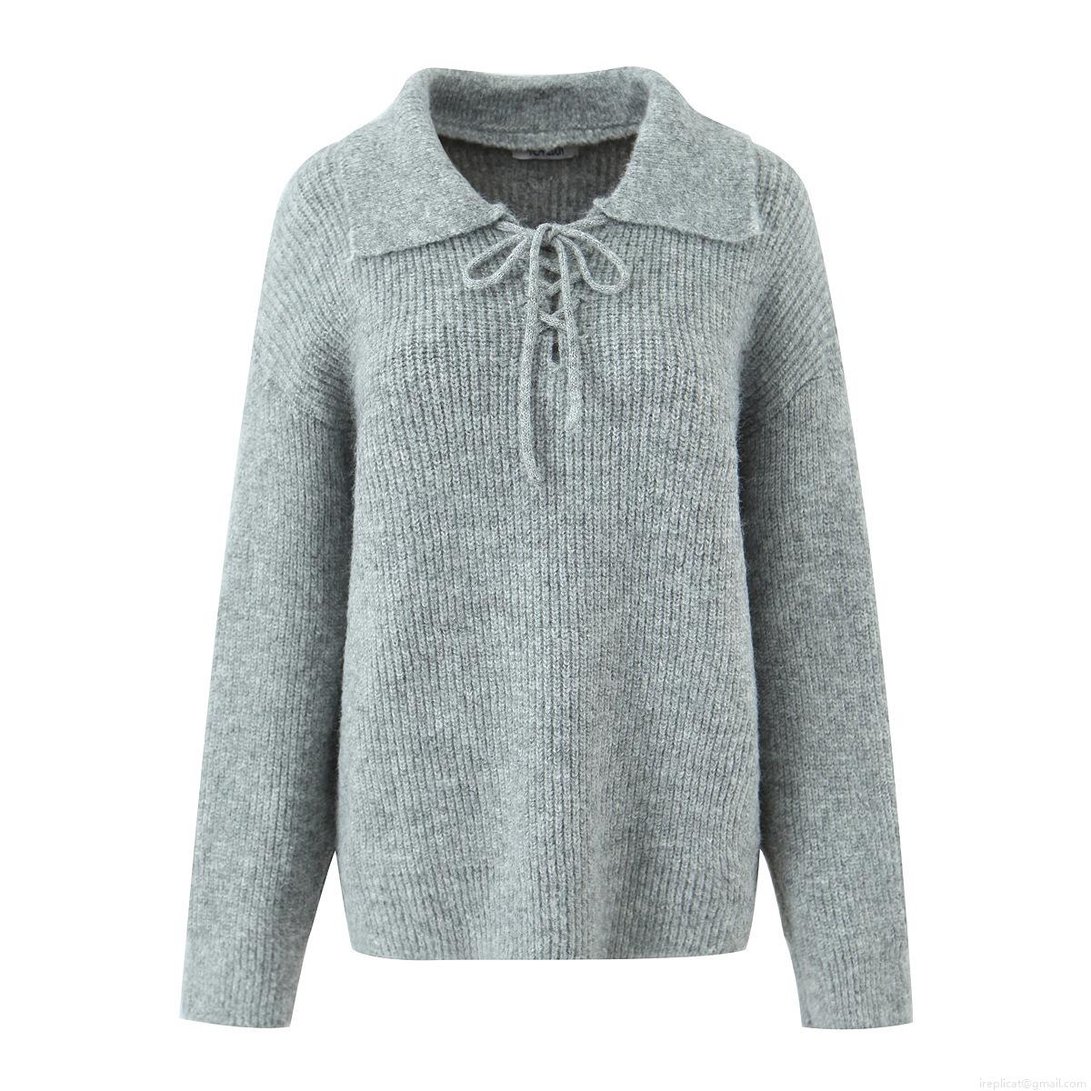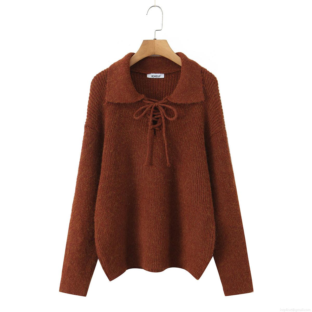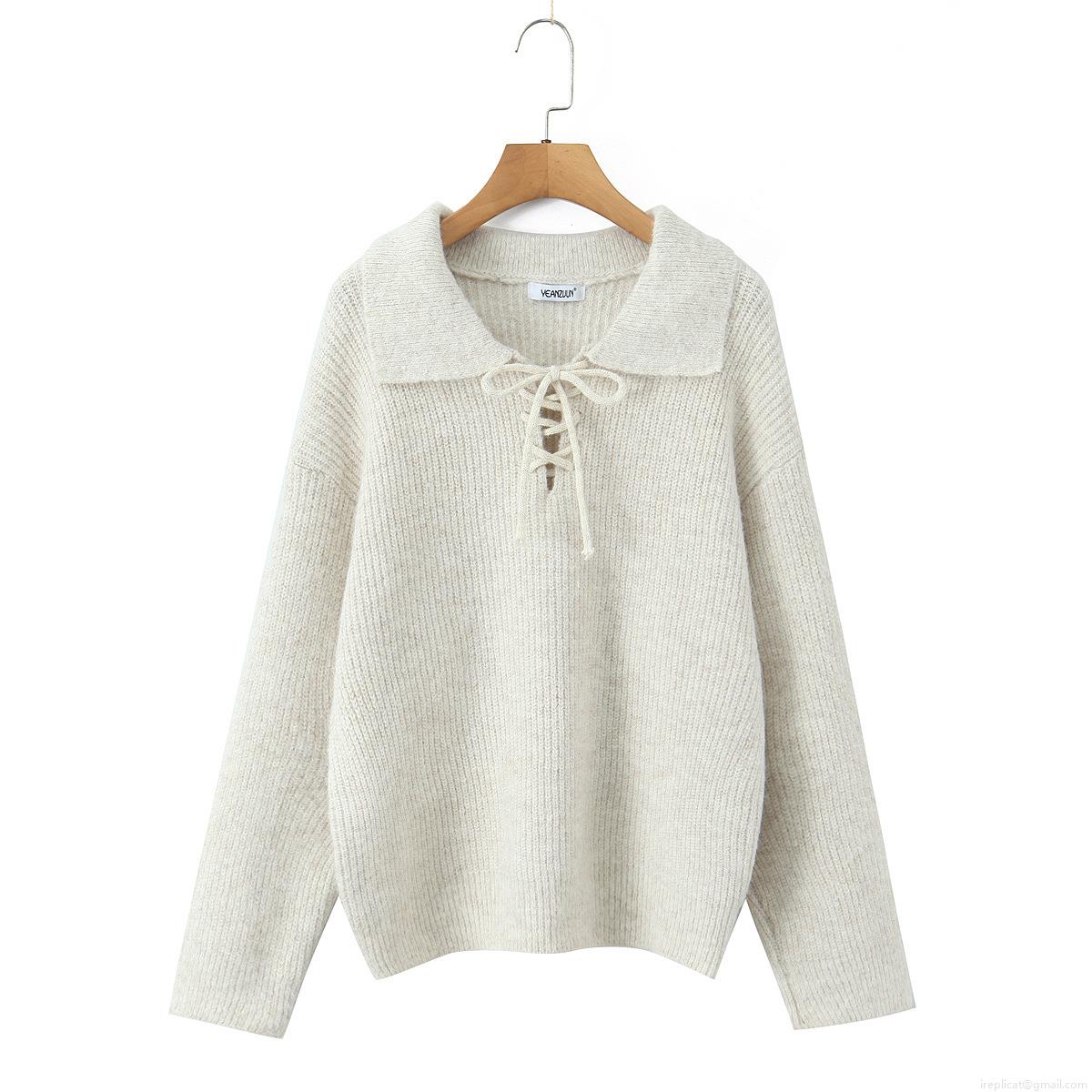 Women's Polyester Nylon Wool Blend Long Sleeve Pullover Sweater With Lapel Collar Lace-up Design Knitted Jumper For Autumn Winter