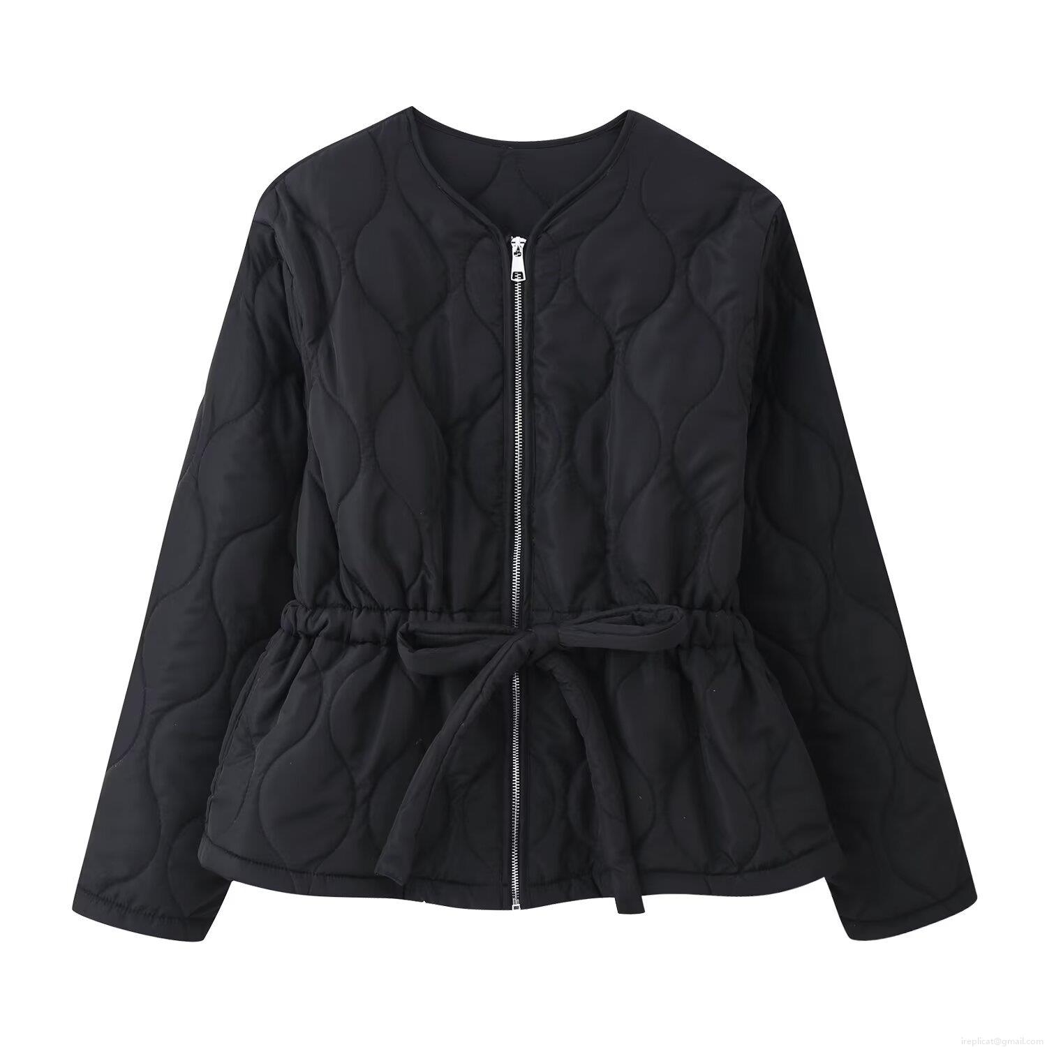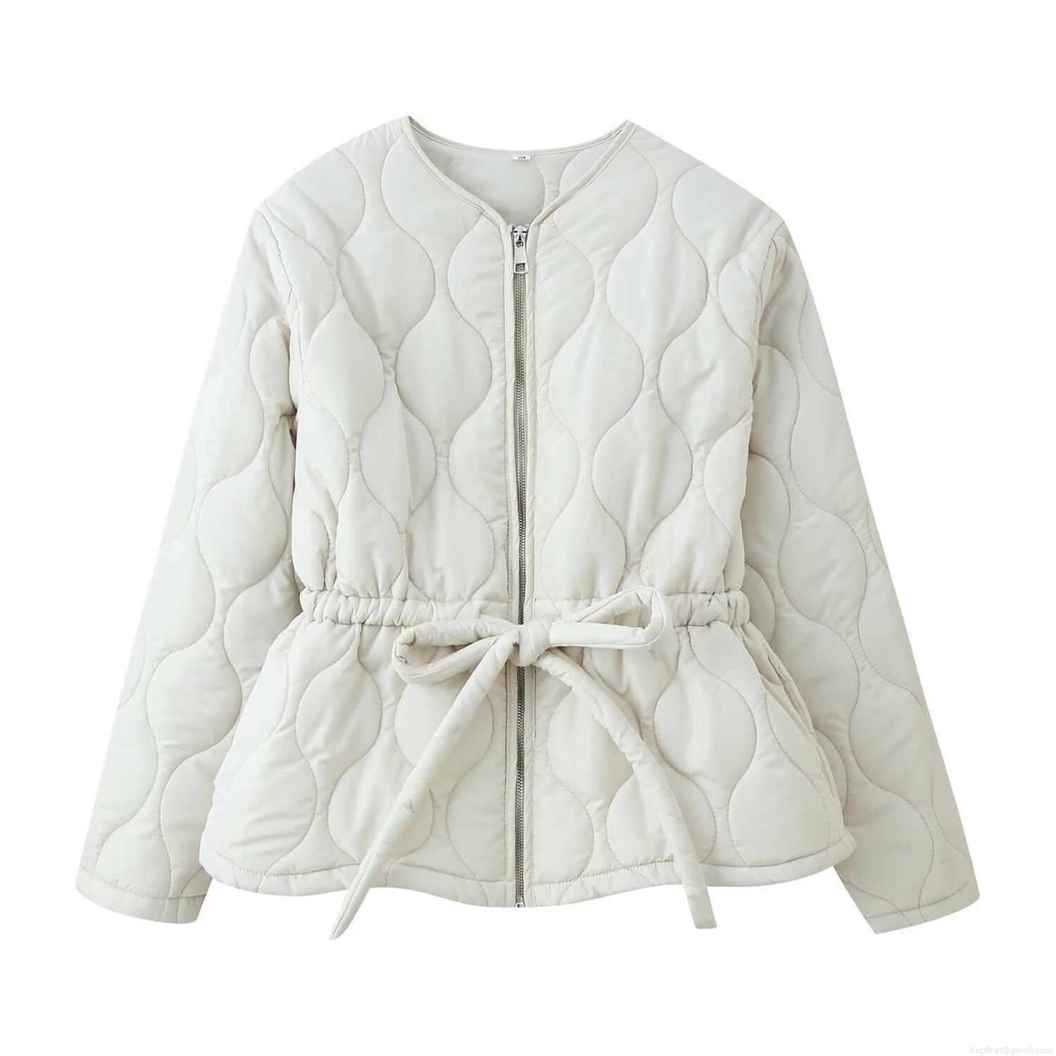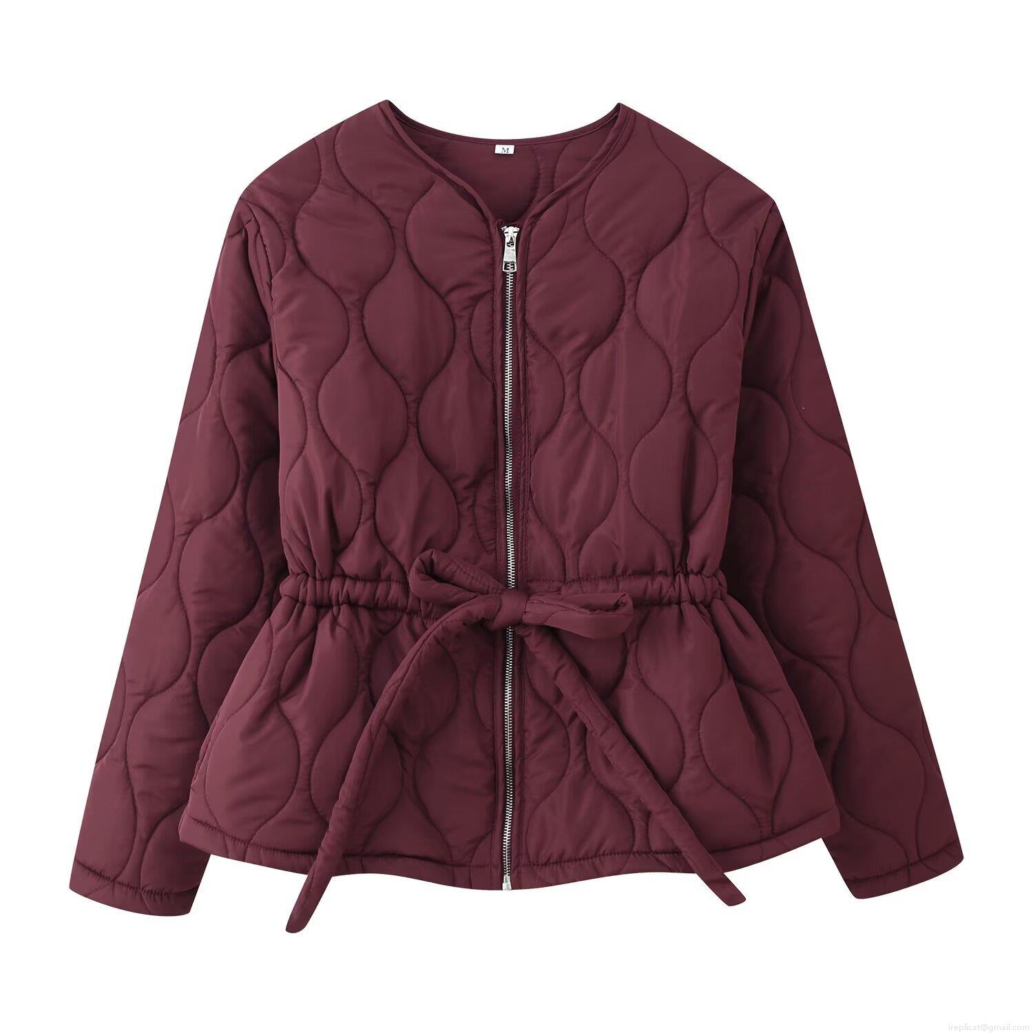 Women's Quilted Cotton Padded Jacket Fashion Round Neck Long Sleeve Waist Tie Coat Casual Polyester Blend Warm Outerwear For Winter Ladies