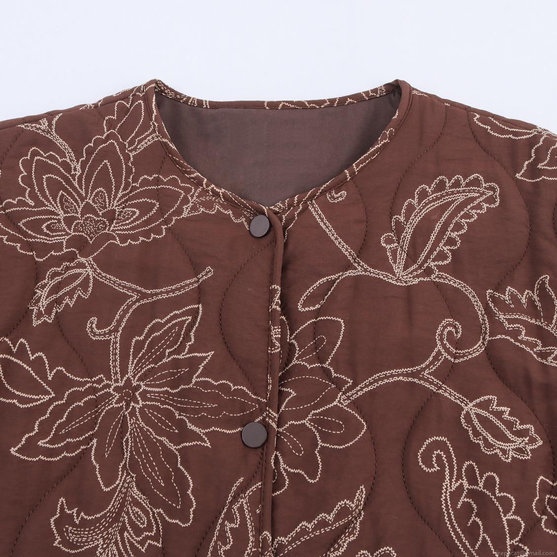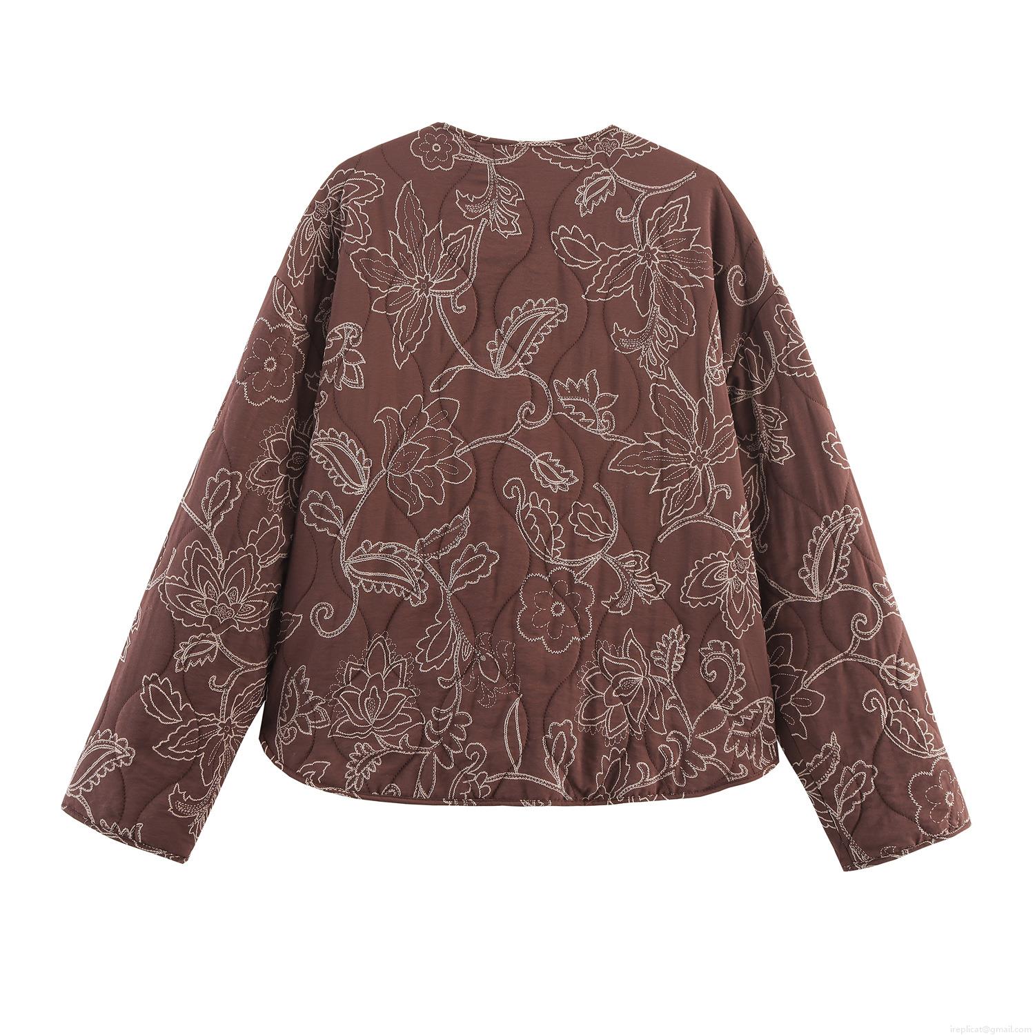 Women's Quilted Floral Embroidered Jacket Round Neck Single Breasted Short Coat Casual Elegant Outerwear Long Sleeve Button Down Brown Fashion Clothing