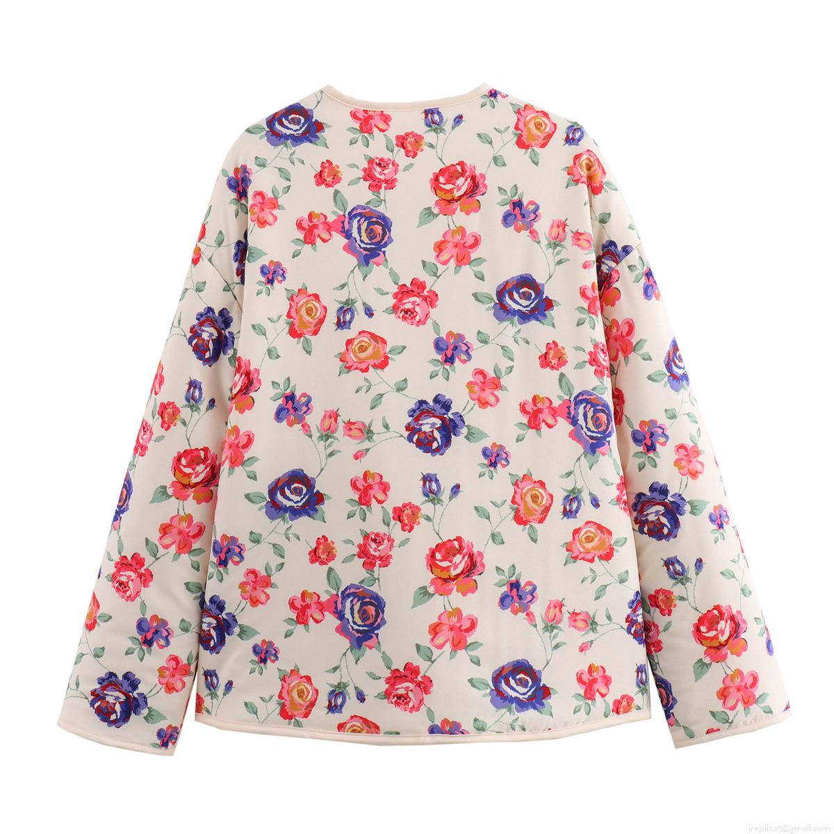 Women's Quilted Floral Print Cotton Jacket Vintage Long Sleeve Round Neck Padded Coat With Pockets Casual Loose Streetwear Outerwear For Spring Autumn