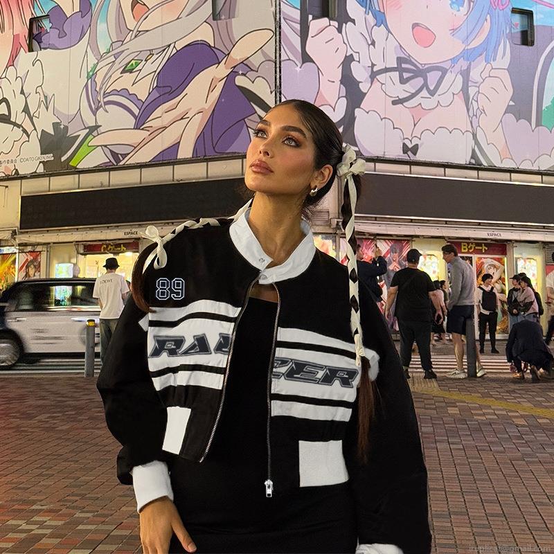 Women's Racing Jacket Contrast Color Letter Print Cropped Bomber Jacket Stand Collar Long Sleeve Streetwear Zip Up Windbreaker Coat Outwear