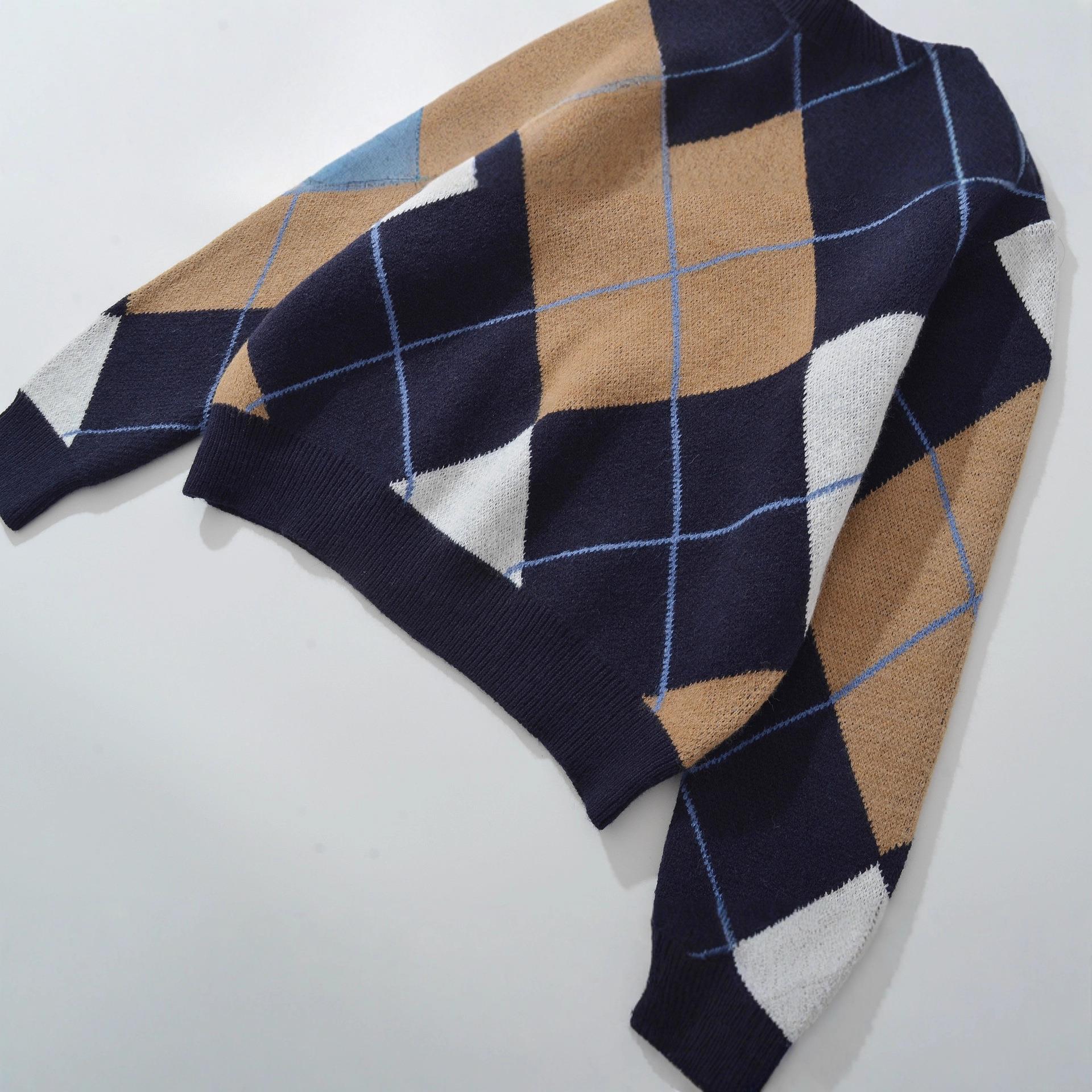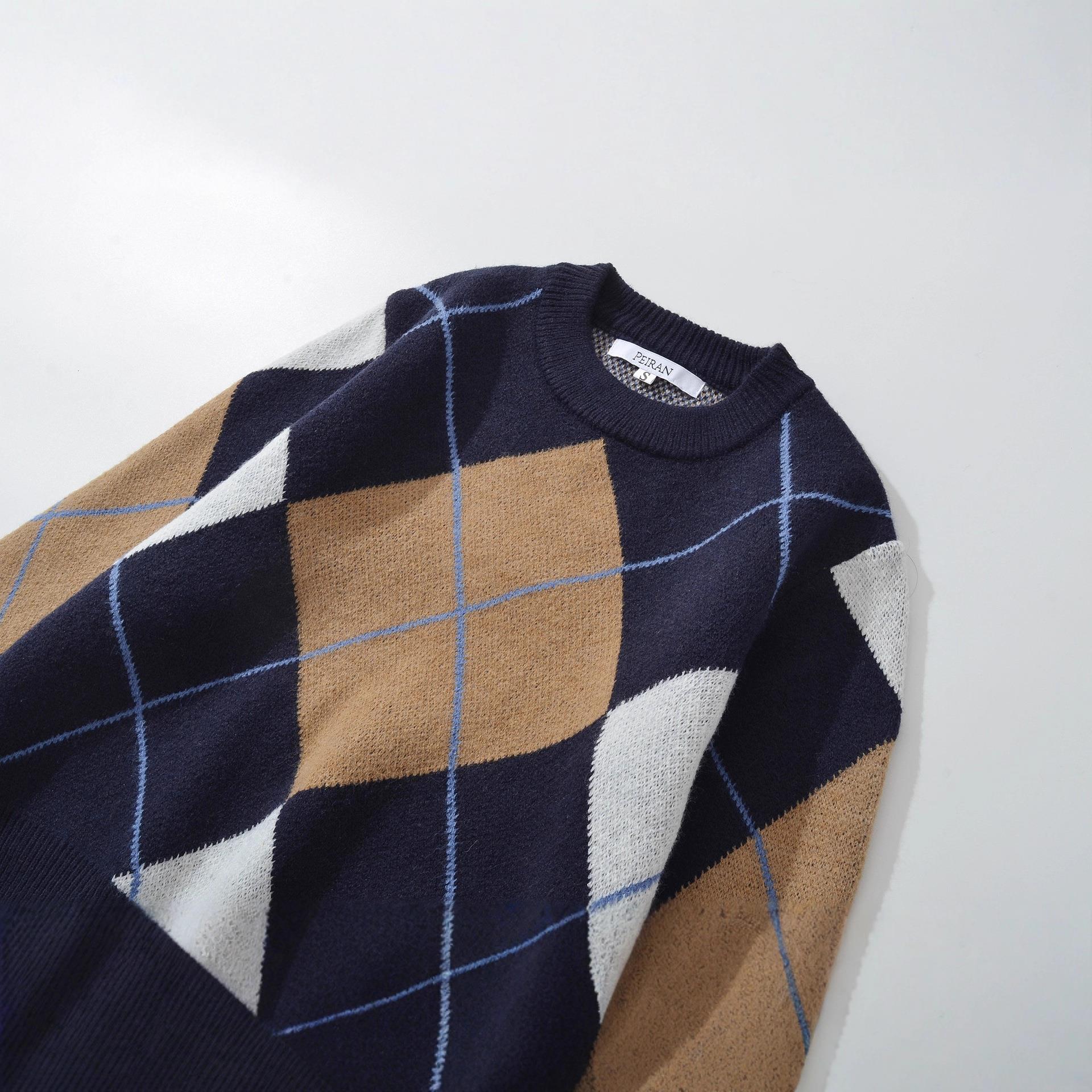 Women's Retro Argyle Knitted Sweater Round Neck Long Sleeve Loose Pullover Contrast Color Patchwork Soft Knit Top Autumn Winter Casual Streetwear Fashion