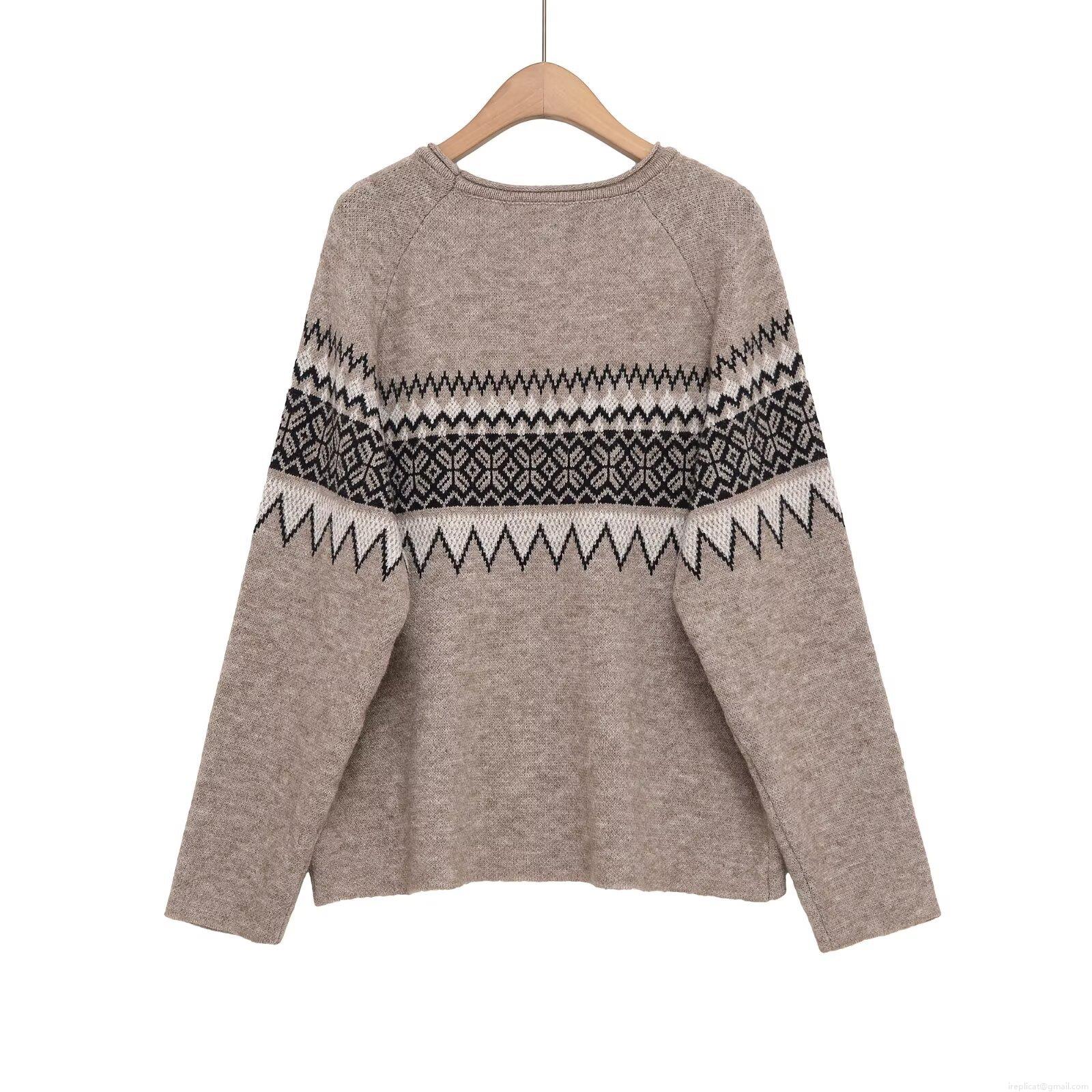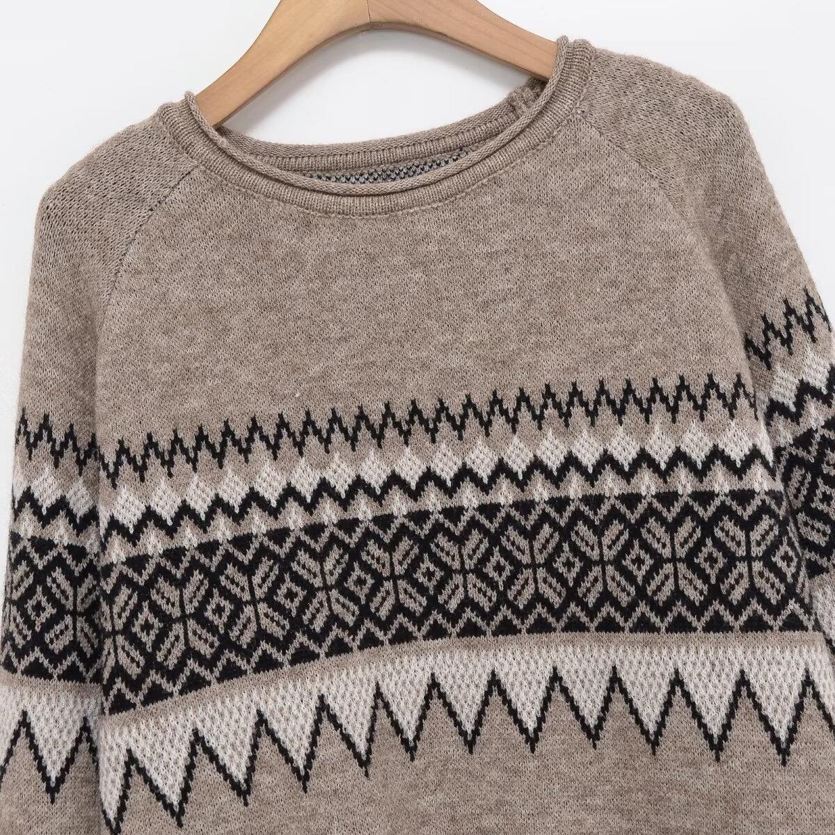 Women's Retro Fair Isle Geometric Jacquard Knit Sweater Loose Crew Neck Long Sleeve Polyester Pullover Autumn Winter Warm Casual Top