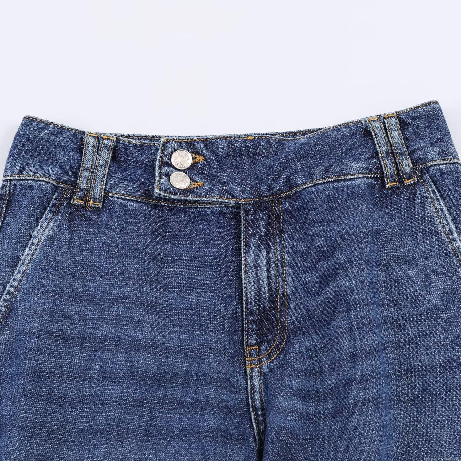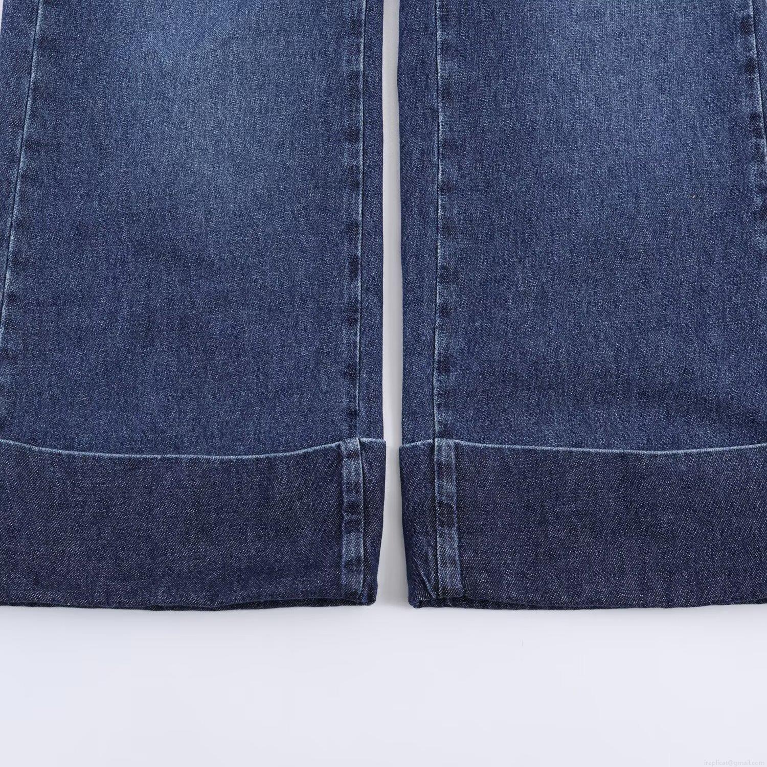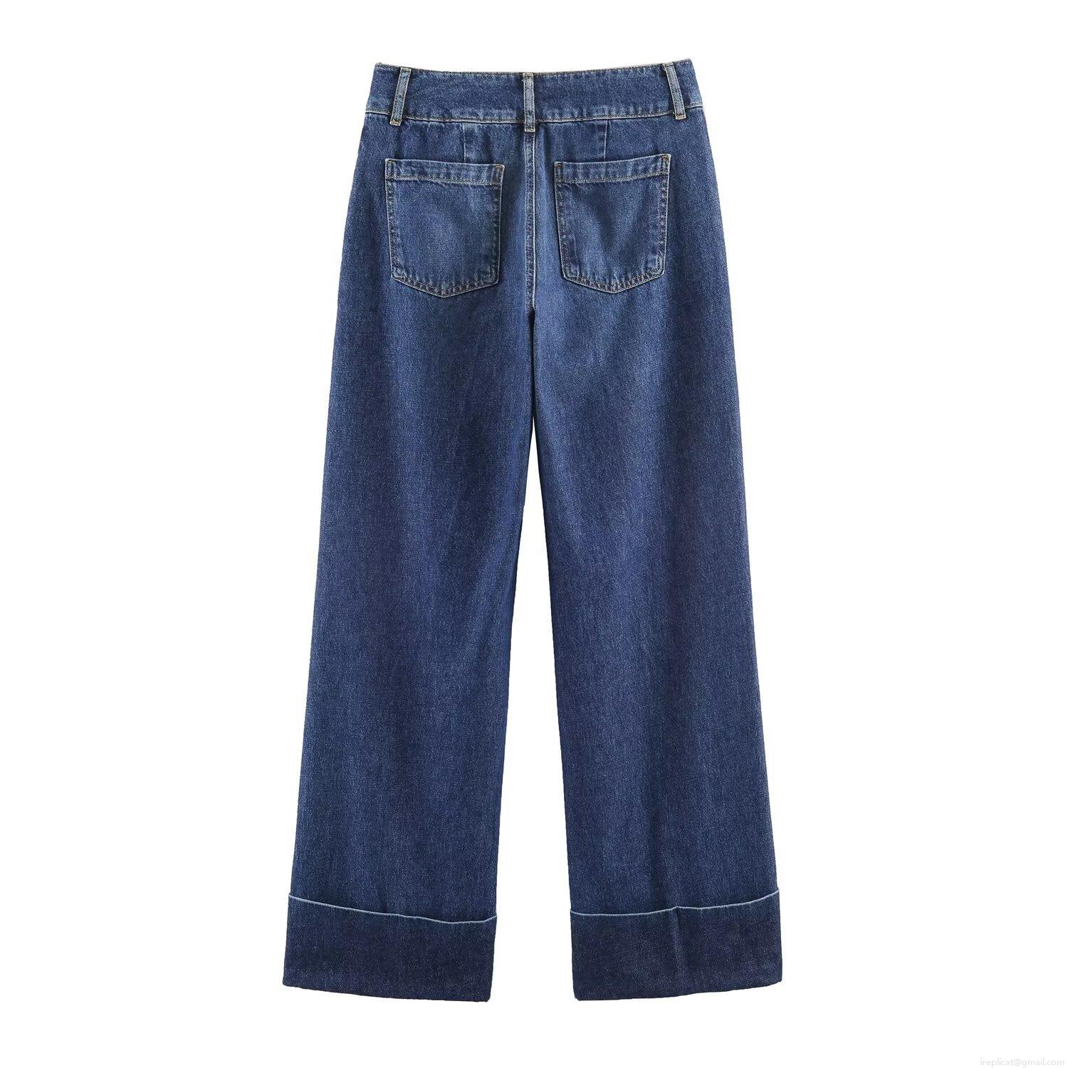 Women's Retro Indigo Blue High Waist Wide Leg Jeans Fashion Cuffed Hem Straight Denim Pants With Double Button Zipper Fly Casual Streetwear Pants