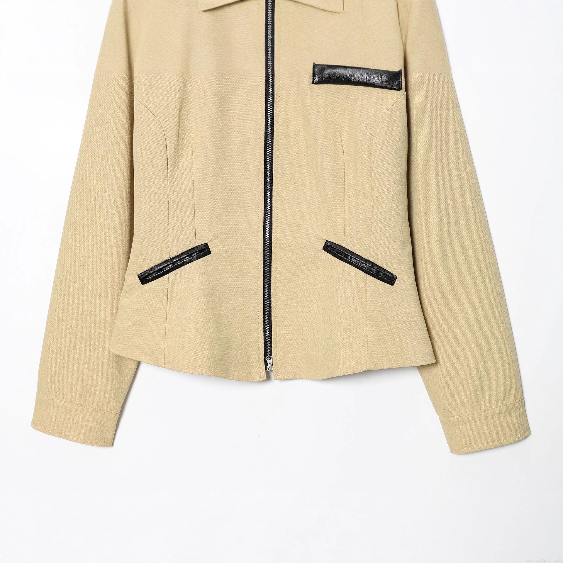 Women's Retro Khaki Canvas Jacket With Black PU Leather Lapel Collar Metal Zipper Short Slim Fit Long Sleeve Outerwear British Style Casual Streetwear For Ladies