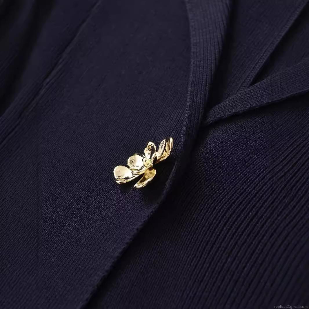 Women's Retro Knit Cardigan Jacket With Gold Flower Bee Buttons Long Sleeve Lapel Collar Knitted Blazer Sweater For Office Casual Navy Blue