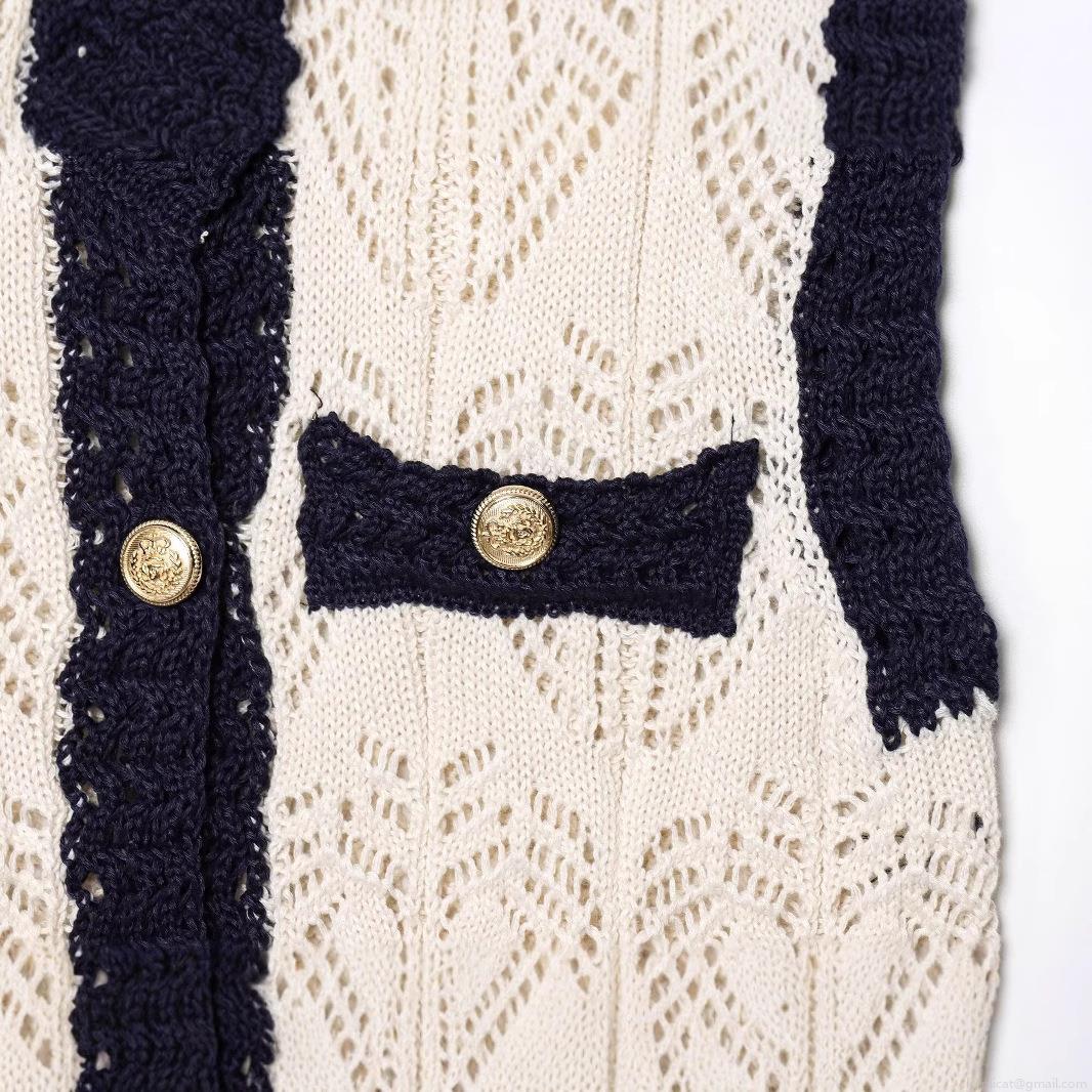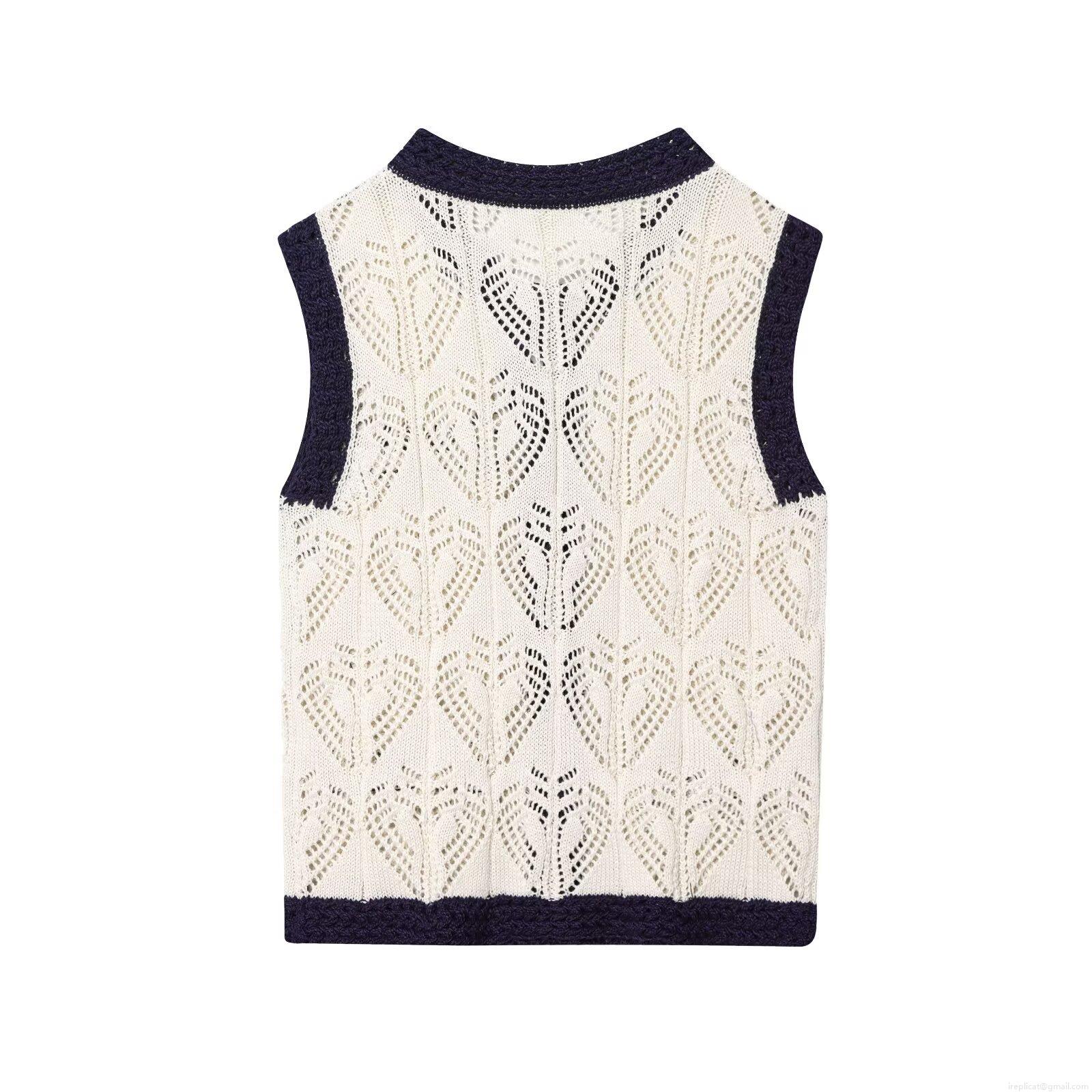 Women's Retro Knit Vest Elegant Heart Shaped Hollow Out Sleeveless Sweater Top With Gold Buttons Contrast Trim Waistcoat For Daily Dating Ladies