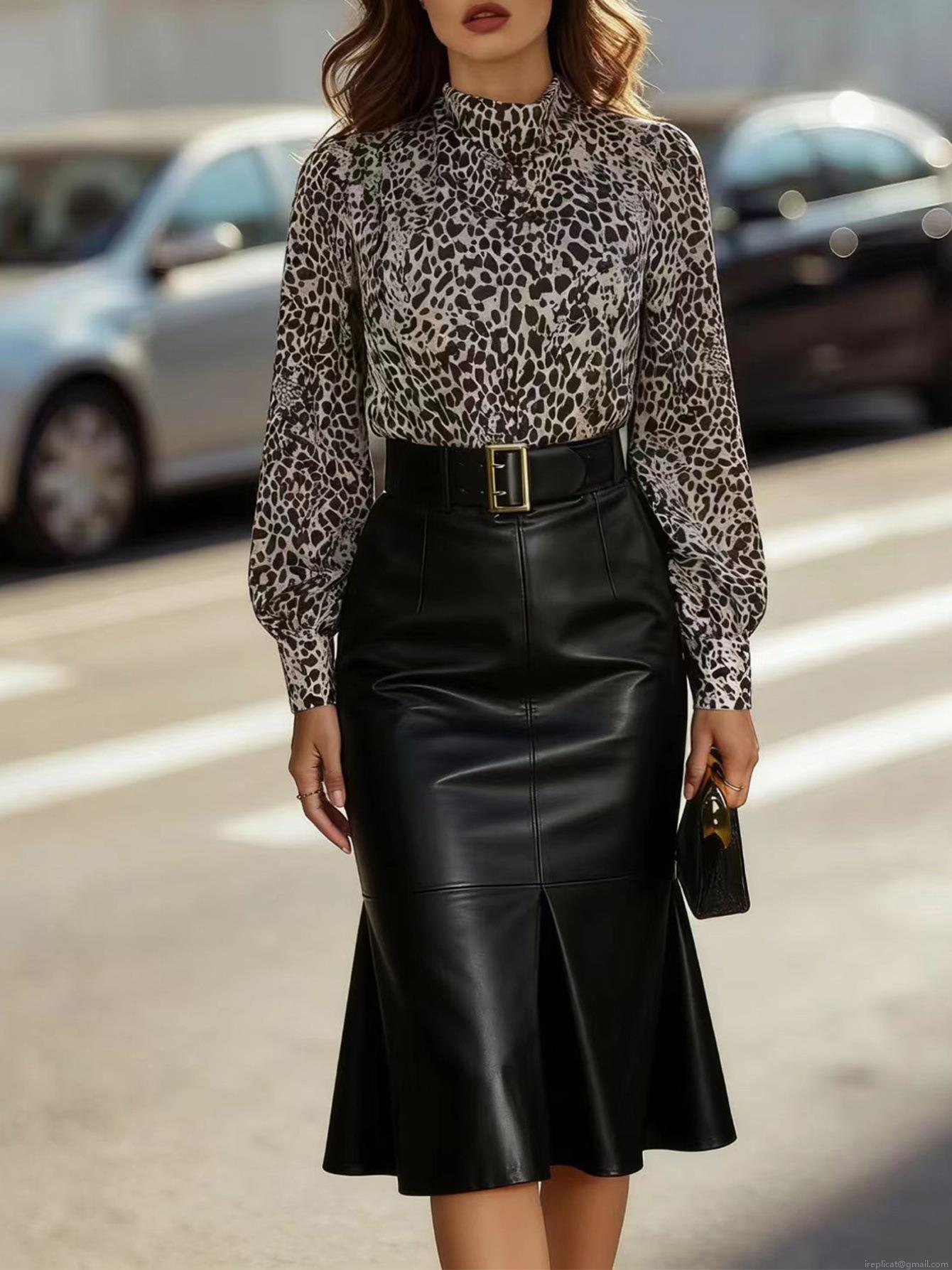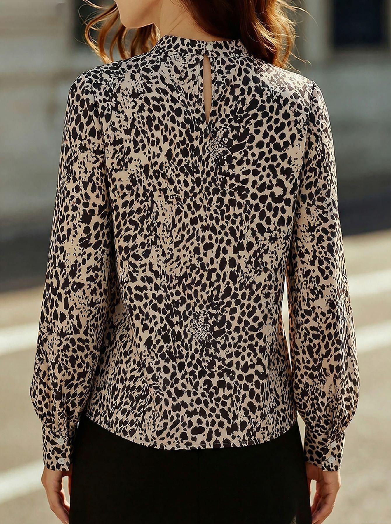 Women's Retro Leopard Print Blouse Mock Neck Lantern Long Sleeve 100% Polyester Pullover Top For Elegant Commuting Ladies Fashion