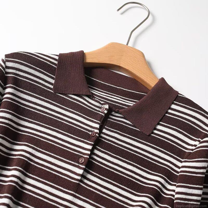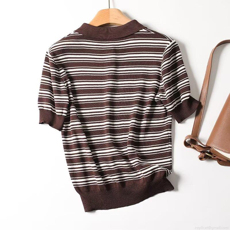 Women's French Knitted Polo Shirt Striped Slim Fit Short Sleeve Lapel...