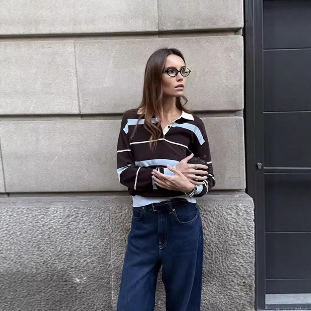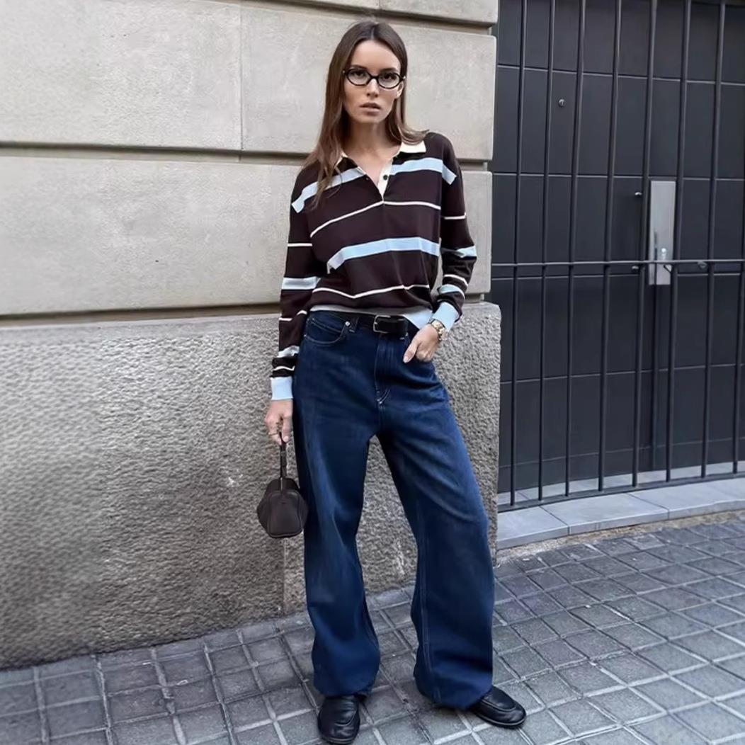 Women's Retro Striped Polo T-Shirt Polyester Blend Long Sleeve Turn-down Collar Contrast Color Chic Streetwear Casual Top For Women
