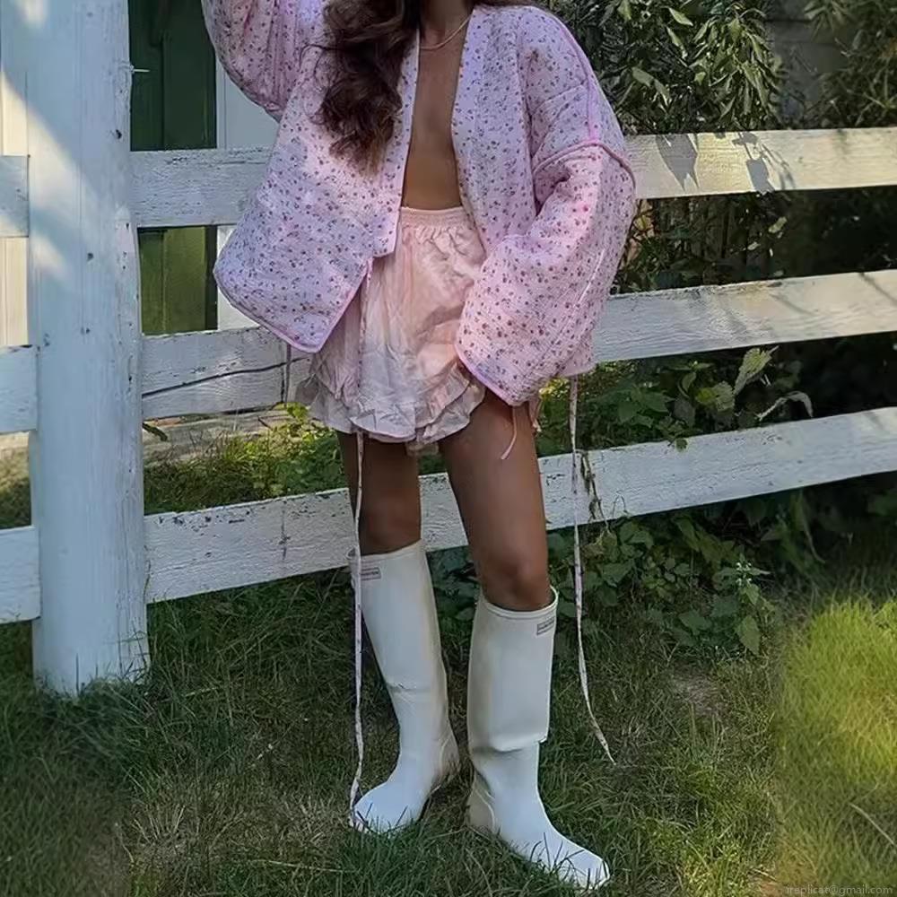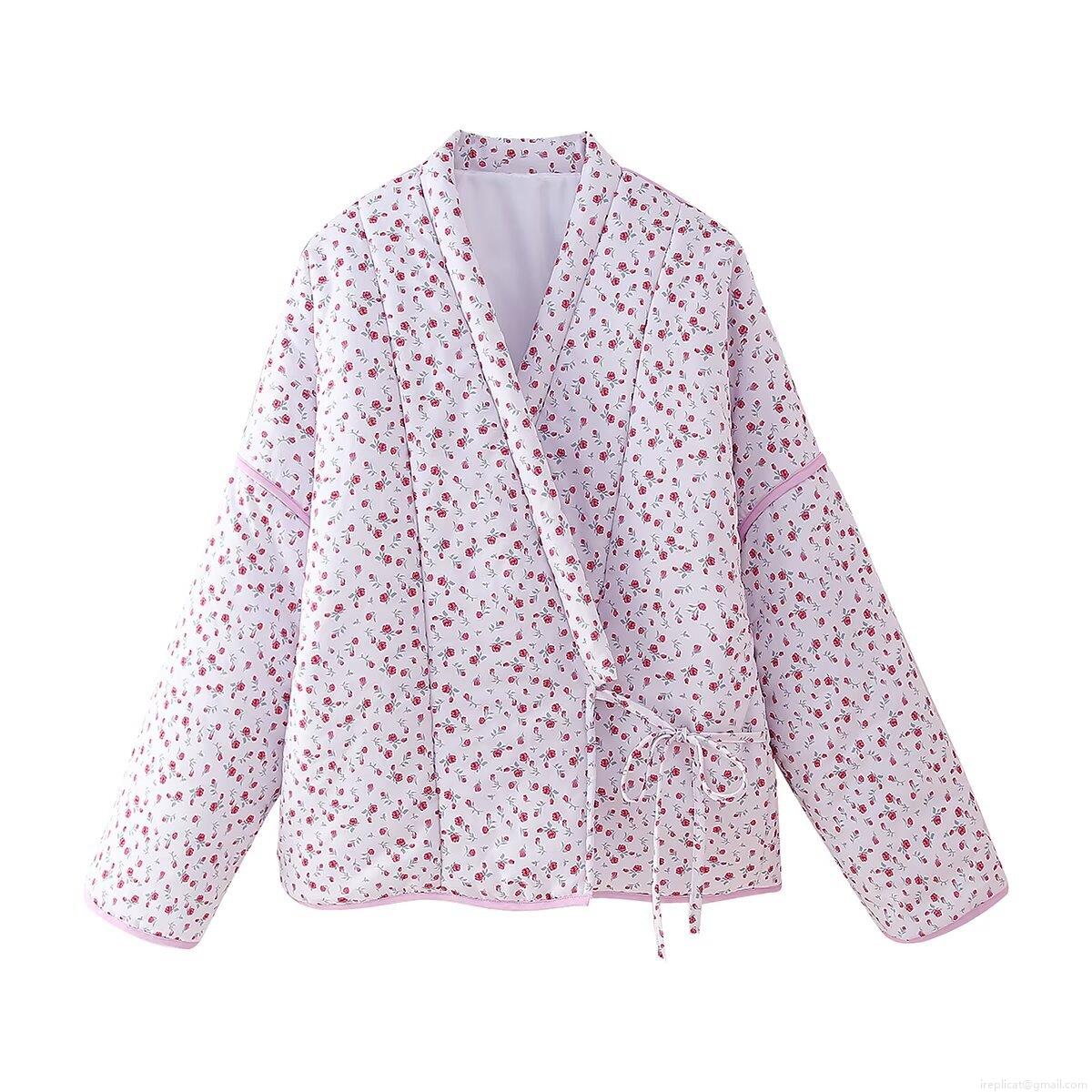 Women's Retro Sweet Floral Print Quilted Padded Jacket 100% Polyester V-Neck Tie-up Loose Fit Long Sleeve Coat For Autumn Winter