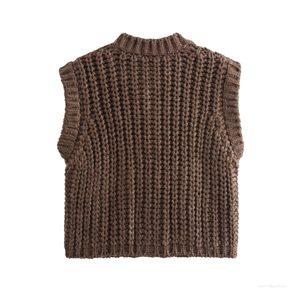Women's Retro Western Coarse Knit Sweater Vest Round Neck Sleeveless Short Cardigan With Metal Buttons And Patch Pockets Loose Autumn Winter Knitwear Top