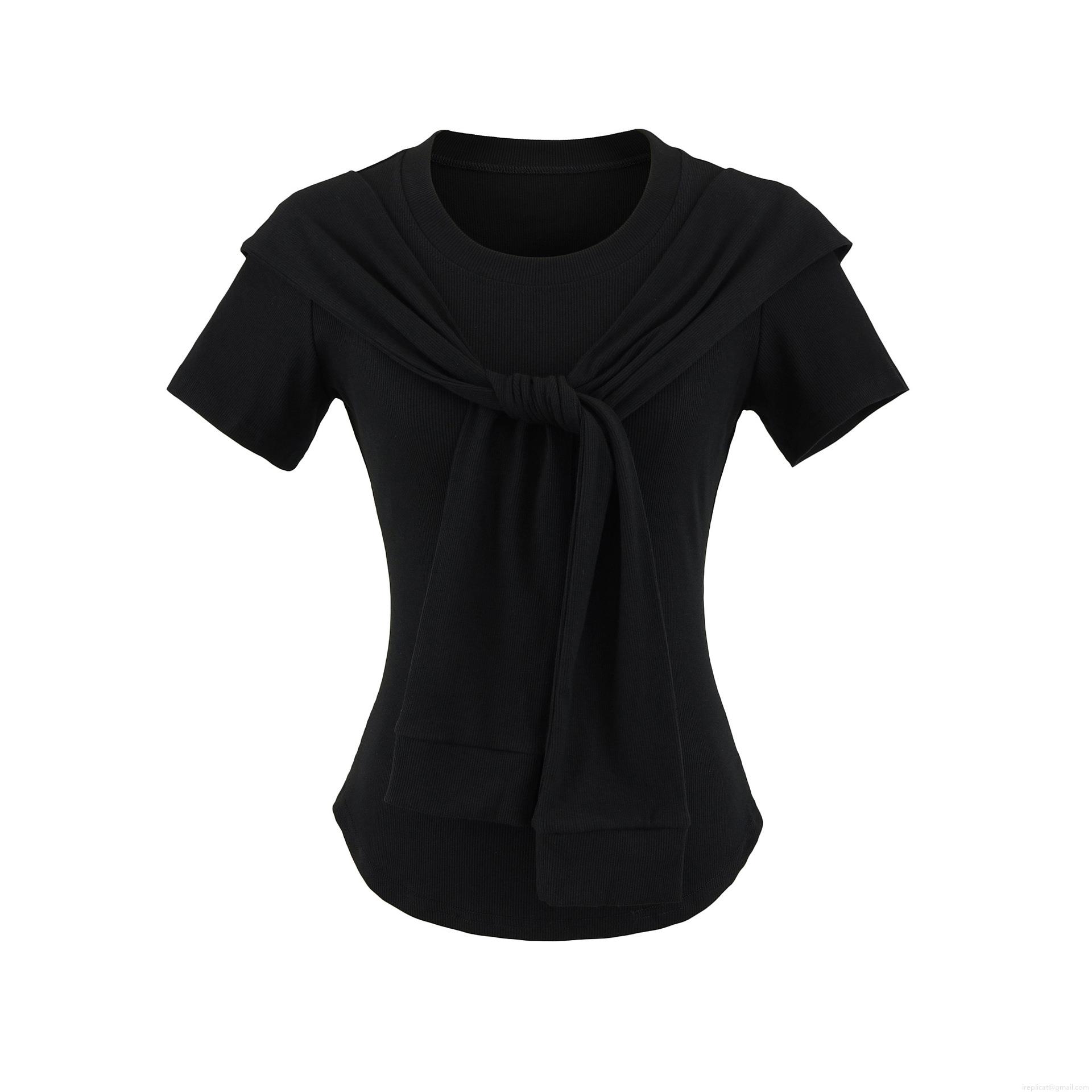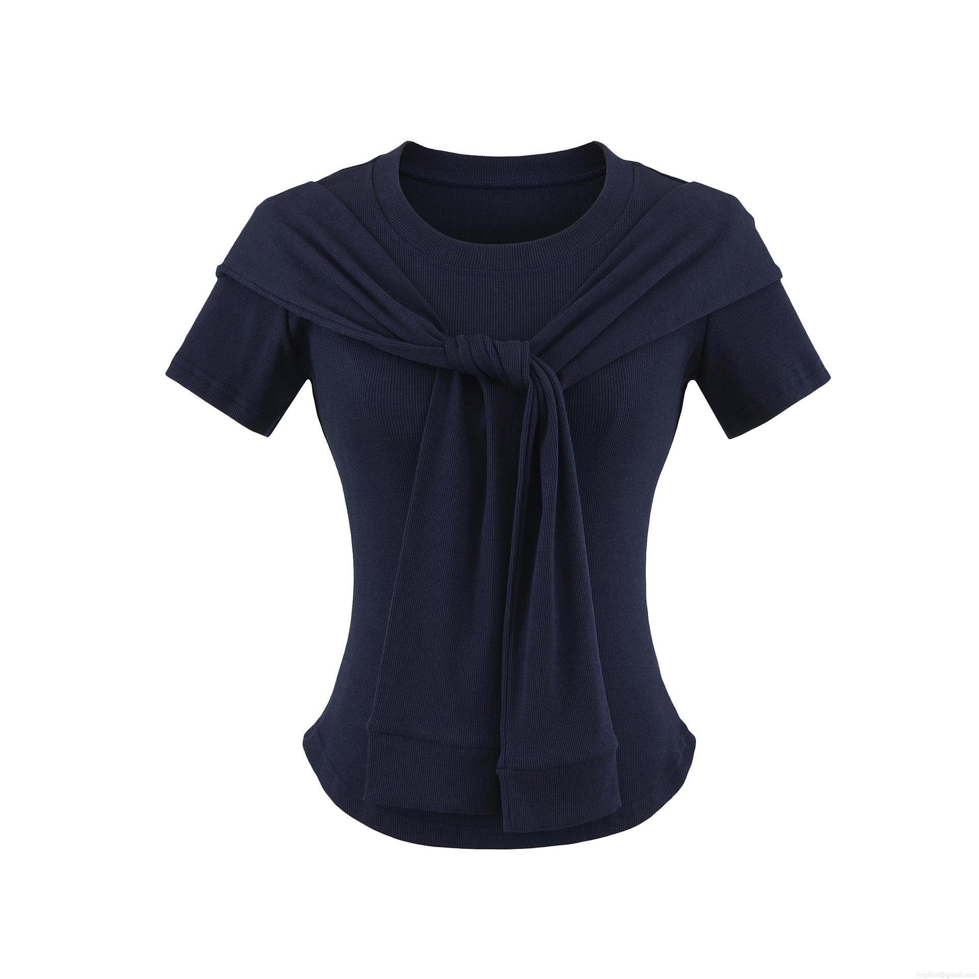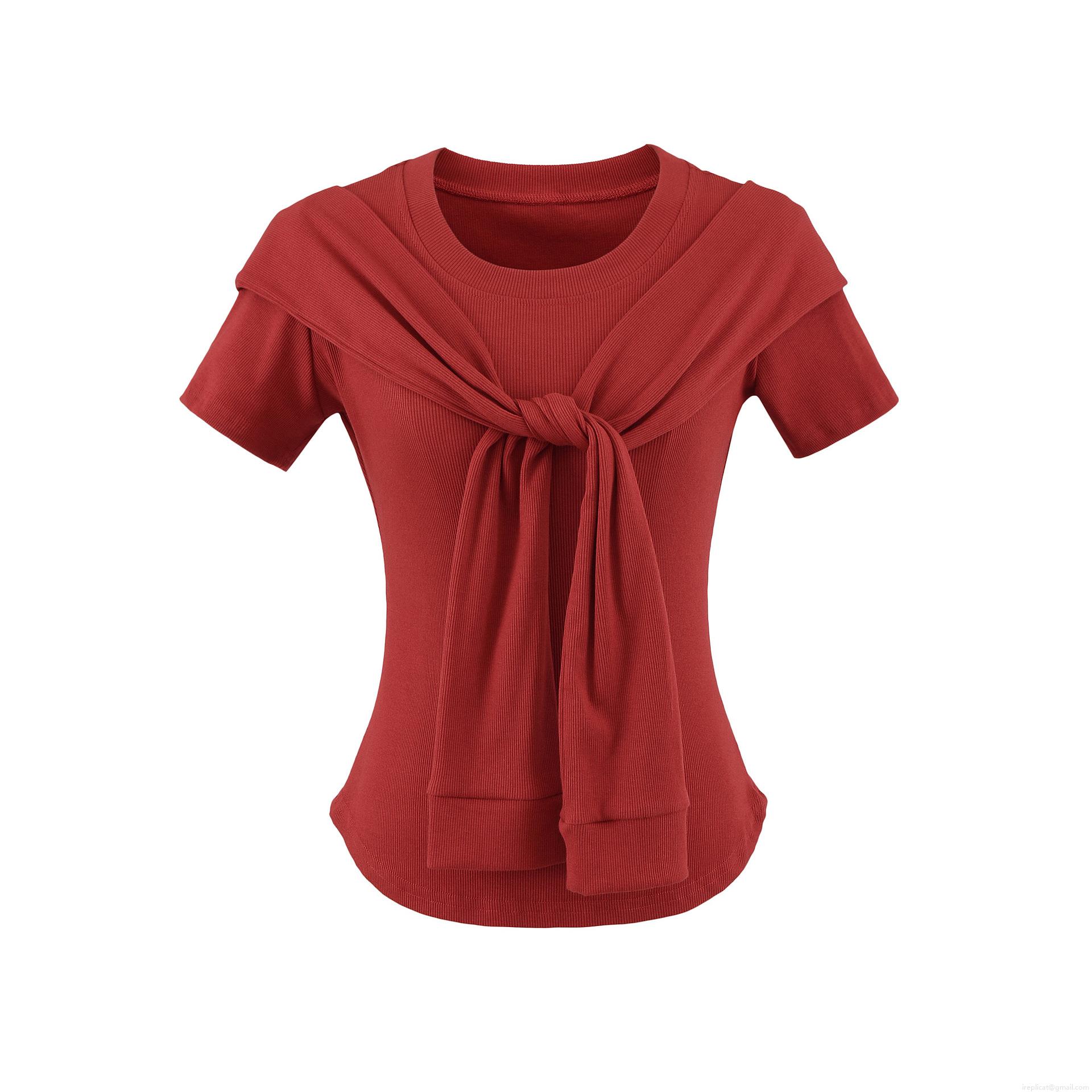 Women's Ribbed Knit T-Shirt Fake Two-Piece Knot Front Shawl Design Short Sleeve Round Neck Cotton Blend Slim Fit Summer Casual Streetwear Top