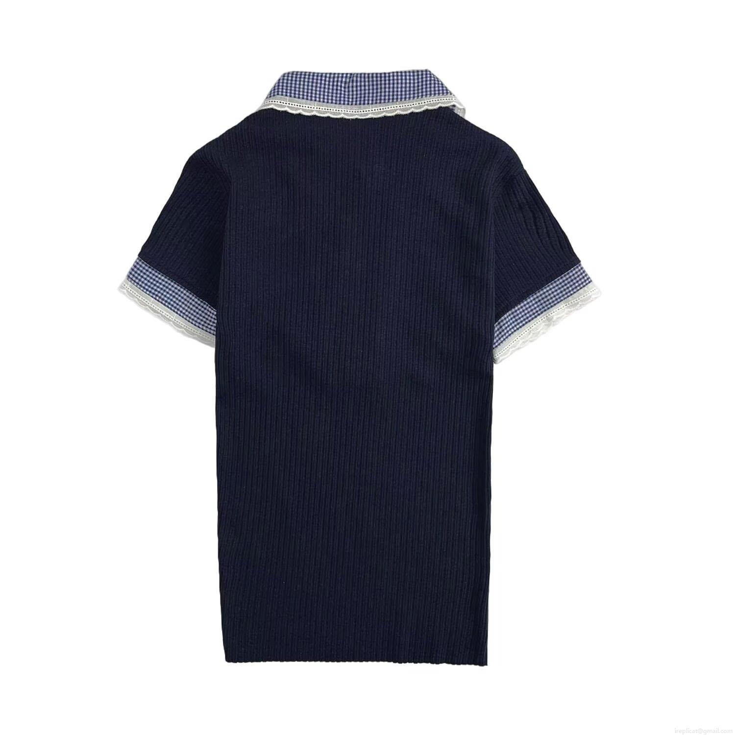 Women's Ribbed Knit T-Shirt Short Sleeve Polo Top With Plaid Lace Trim Lapel Collar Casual Summer Patchwork Contrast Pullover For Daily Wear