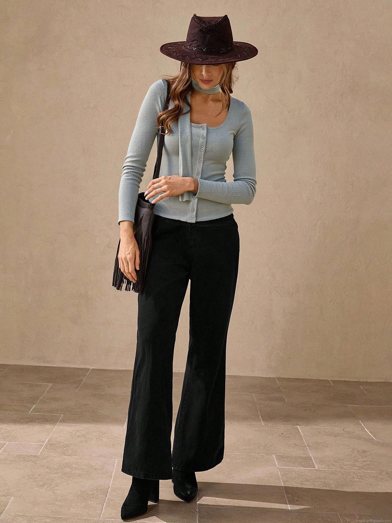 Women's Ribbed Knit T-Shirt With Button Front And Matching Scarf Long Sleeve Slim Fit Polyester Elastane Cardigan Style Top For Early Autumn Daily Casual Wear