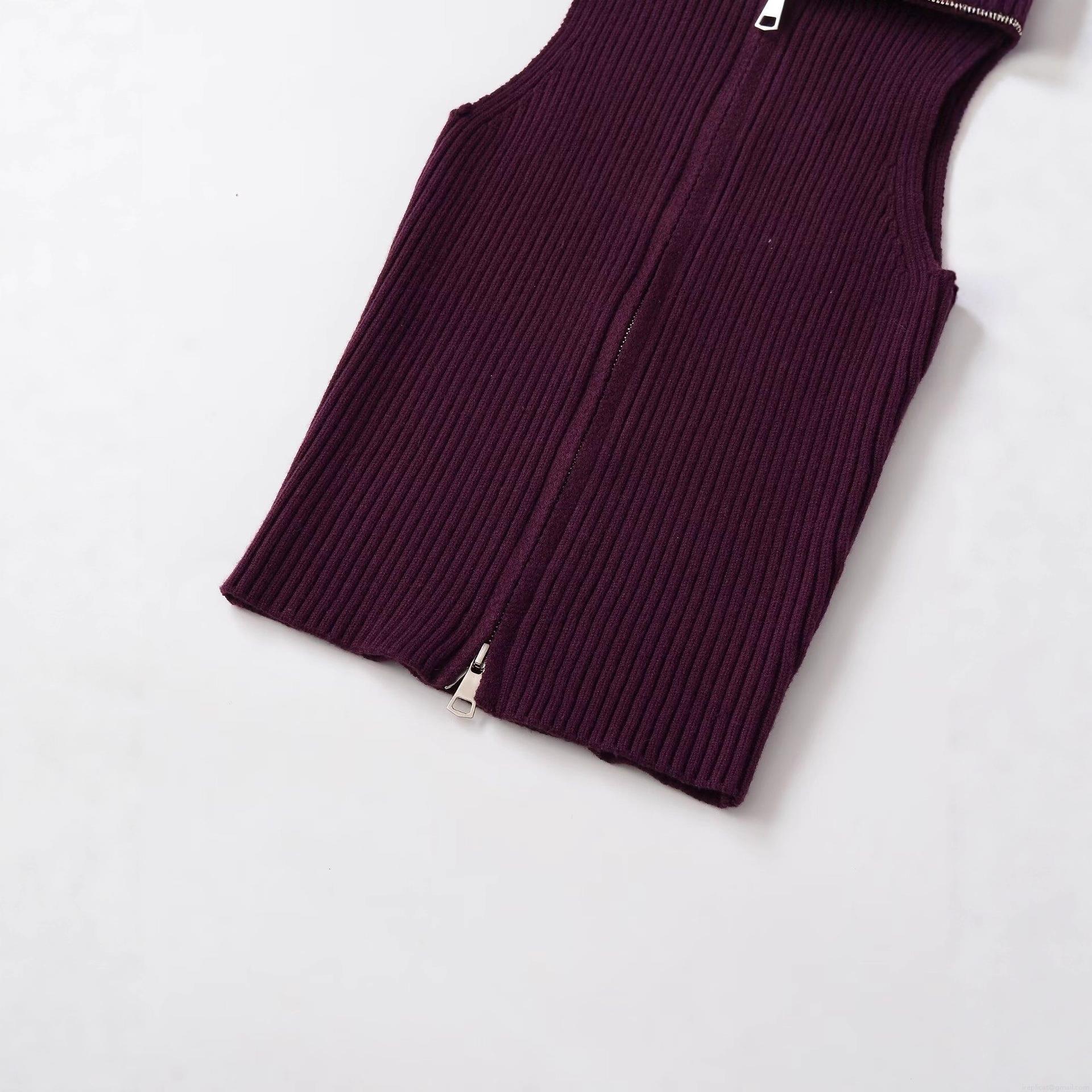 Women's Ribbed Knit Vest Sleeveless Zip Up Lapel Sweater Top Solid Wine Red Slim Fit Streetwear Autumn Pullover Waistcoat For Lady