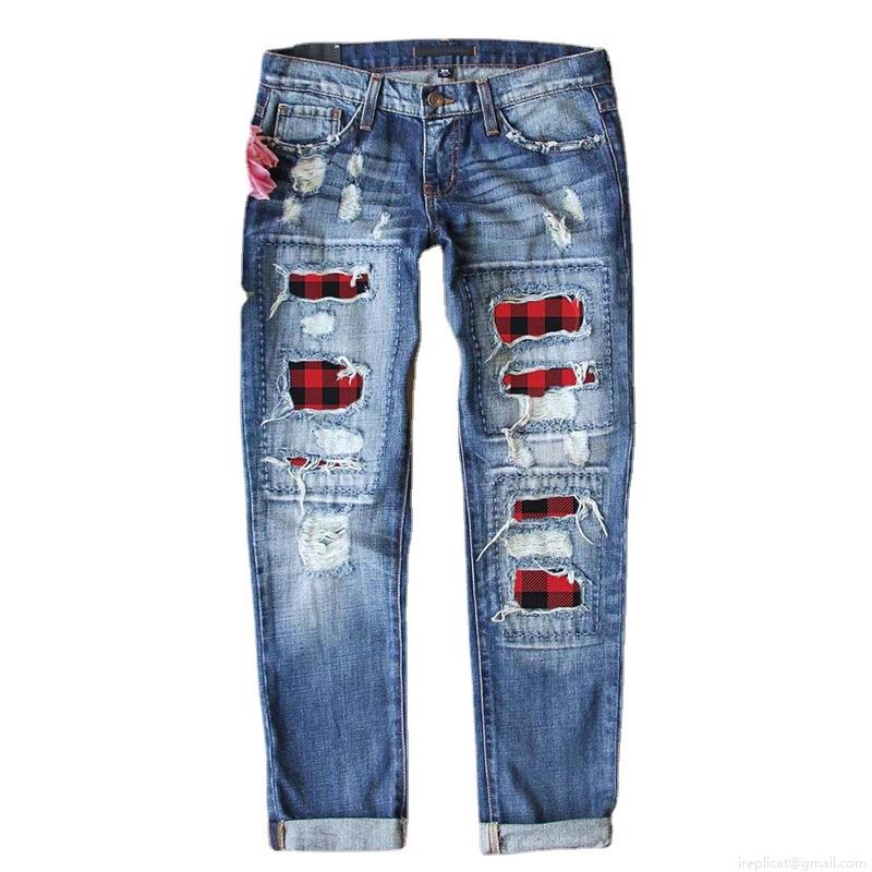 Women's Ripped Denim Jeans Blue Distressed Patchwork Red Plaid Straight Leg Long Pants Streetwear Fashion Trousers Casual Daily Wear Cotton Blend Denim
