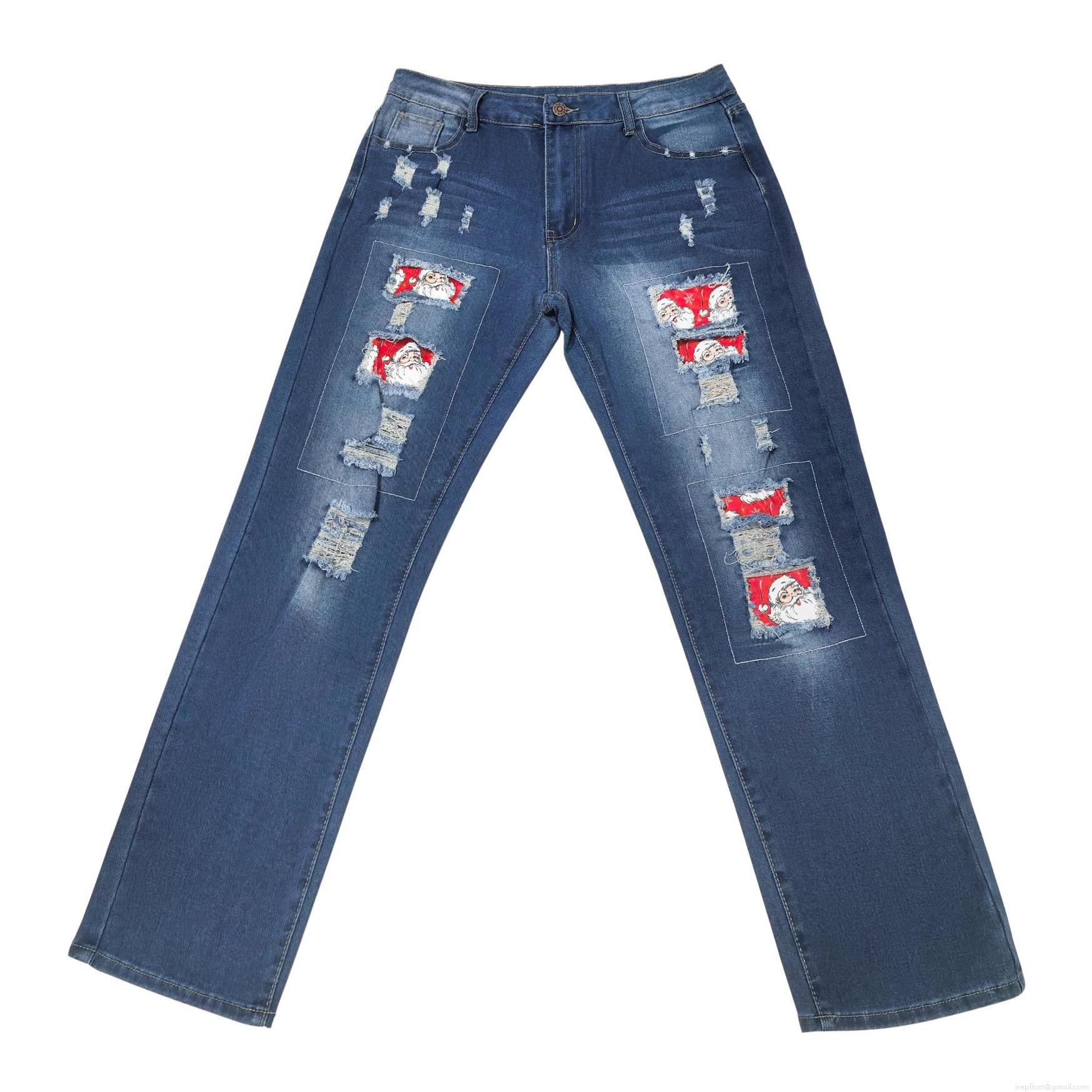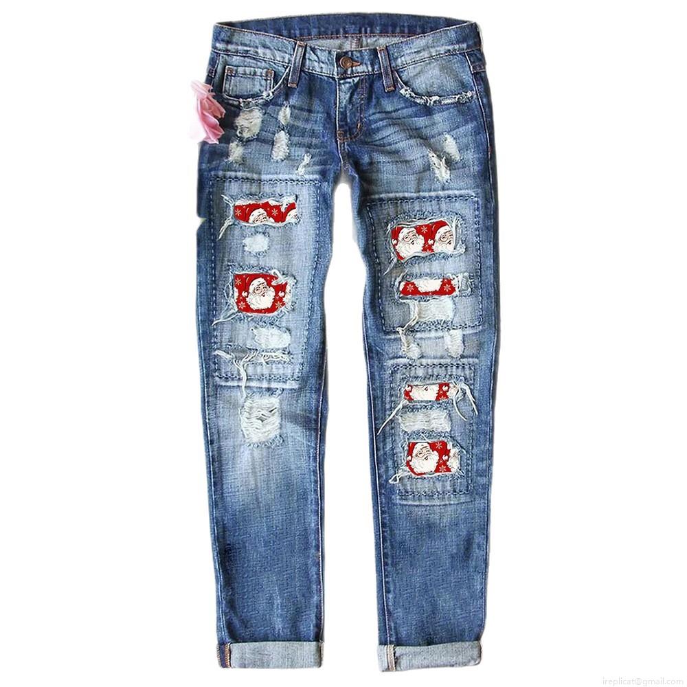Women's Ripped Straight Leg Jeans Washed Denim Cotton Pants With Santa Claus Patch Distressed Christmas Holiday Party Trousers For Women