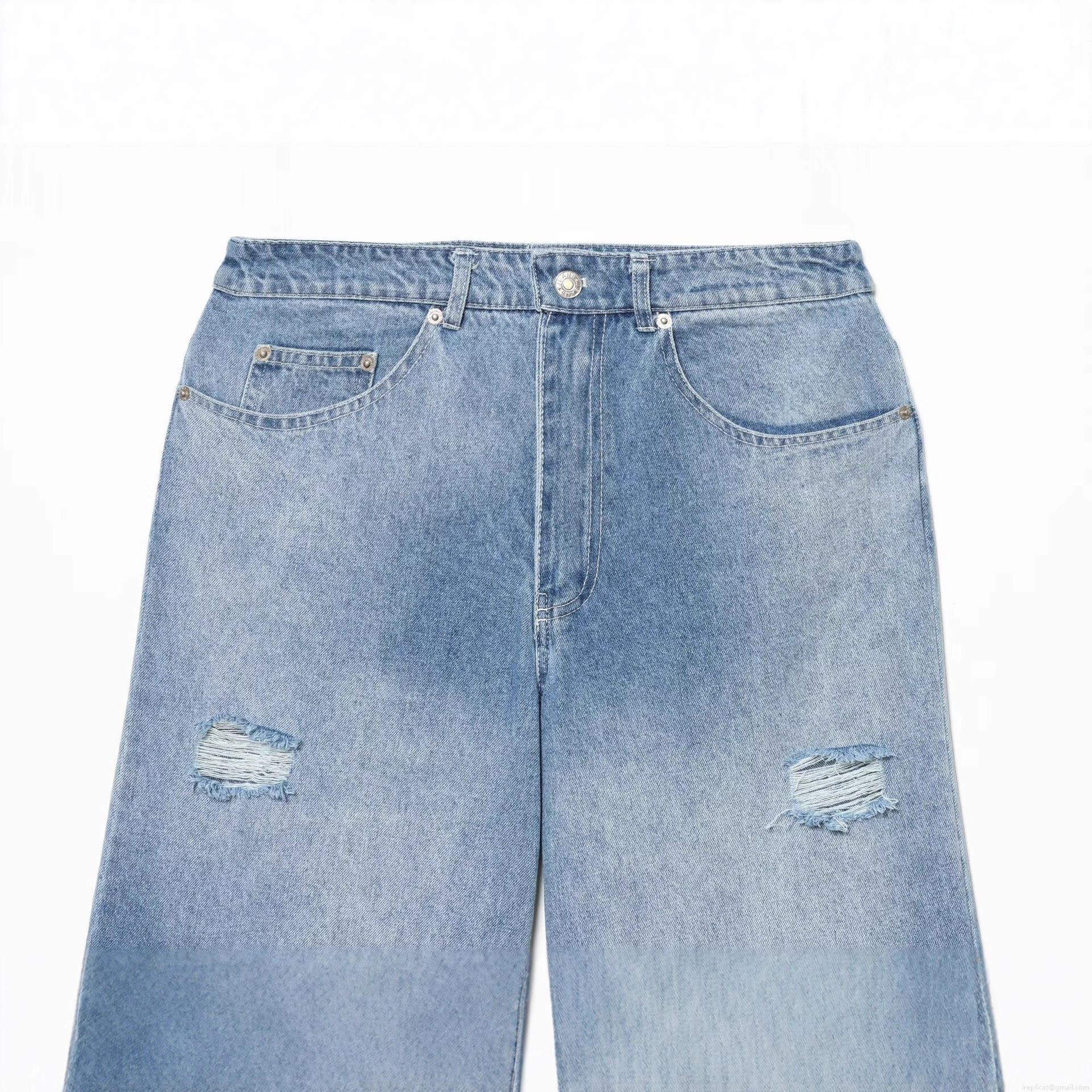 Women's Ripped Wide Leg Jeans Washed Blue Distressed Denim Cropped Pants High Waist Baggy Retro Streetwear Fashion Trousers for Women