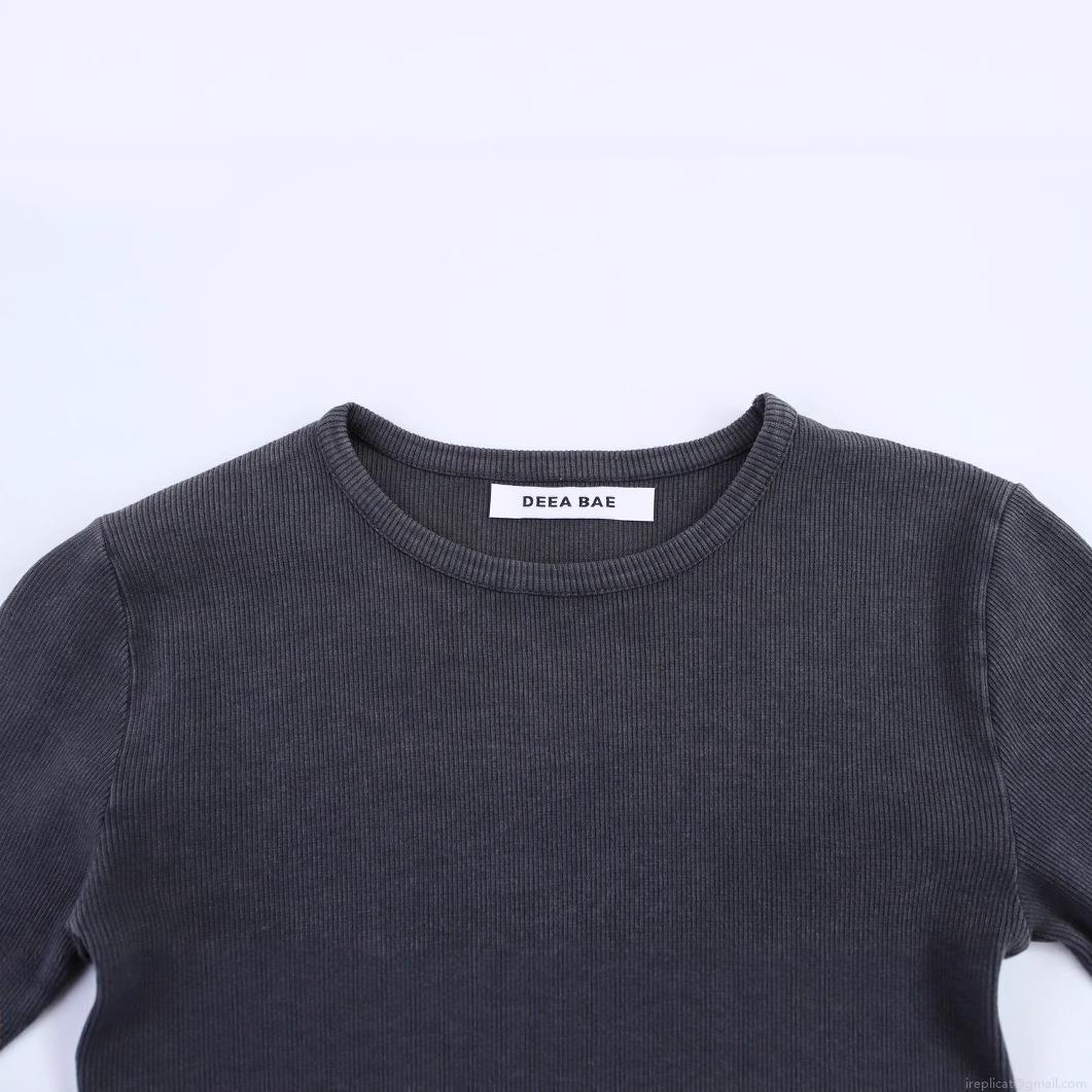 Women's Round Neck Long Sleeve Rib Knit T-Shirt With Belt Asymmetrical Hem Design Solid Charcoal Grey Streetwear Polyester Top For Spring Summer