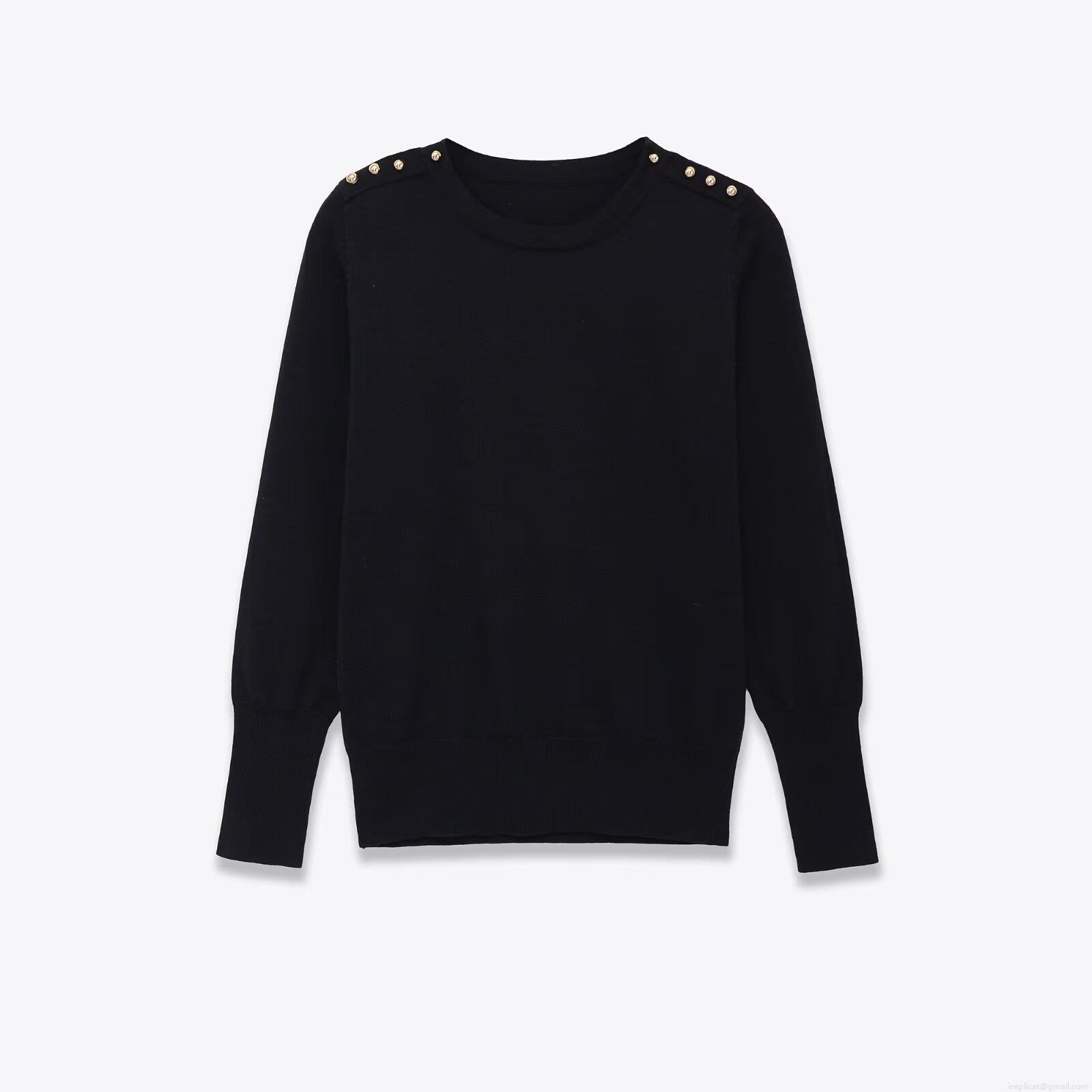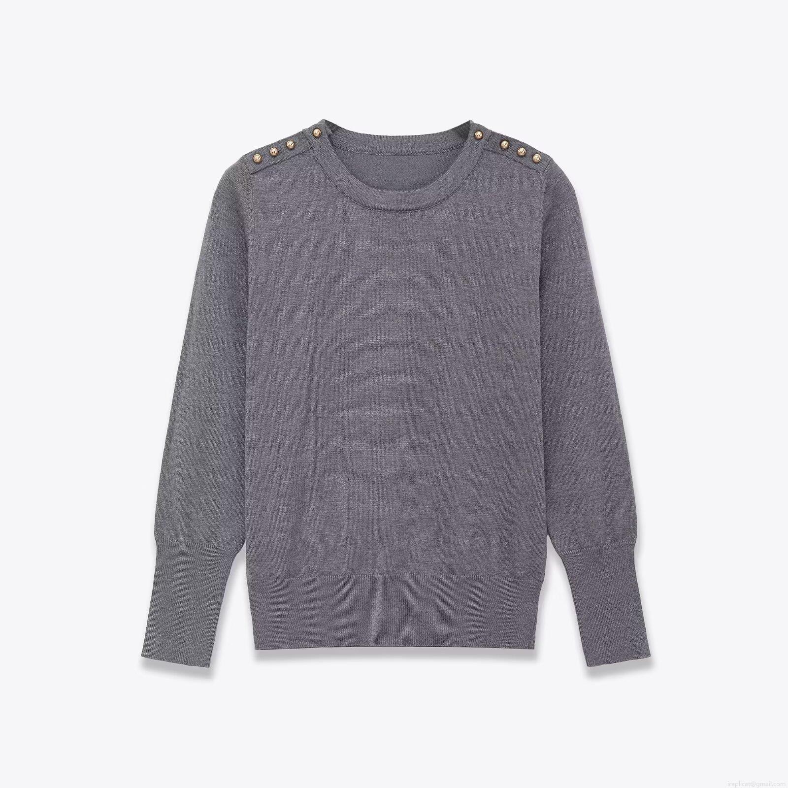 Women's Round Neck Pullover Sweater Long Sleeve Polyester Knit Top With Shoulder Gold Buttons Solid Color Fashion Casual Jumper For Autumn Winter