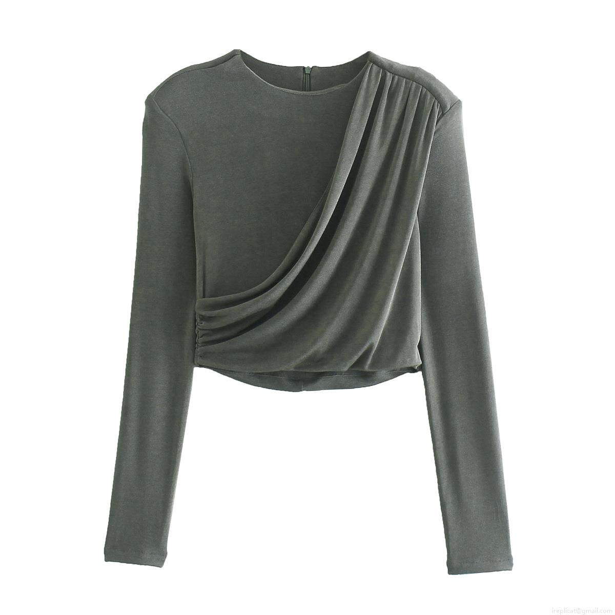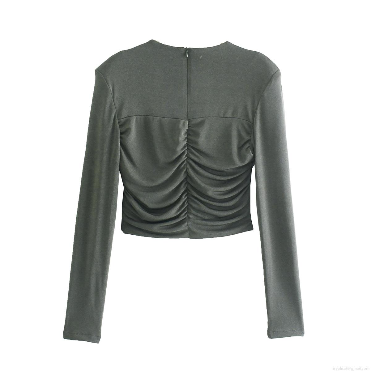 Women's Ruched Long Sleeve Crop Top With Shoulder Pads Slim Fit Round Neck Solid Color Elastic Polyester Pullover Streetwear Fashion Tee For Ladies