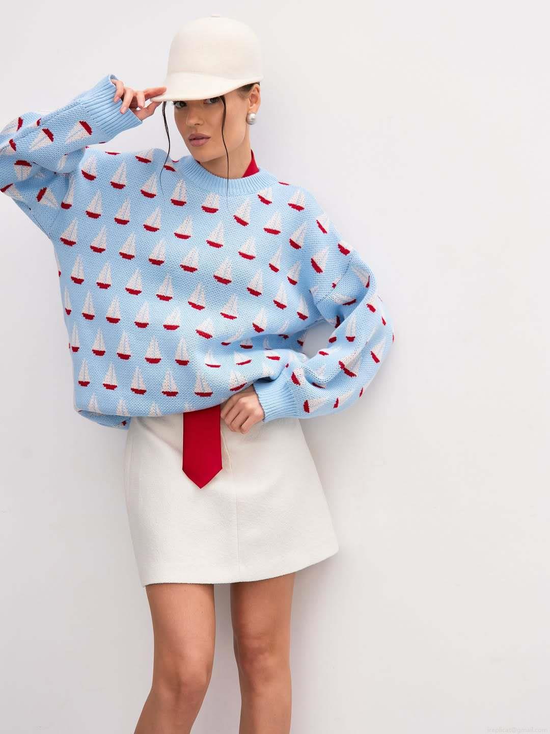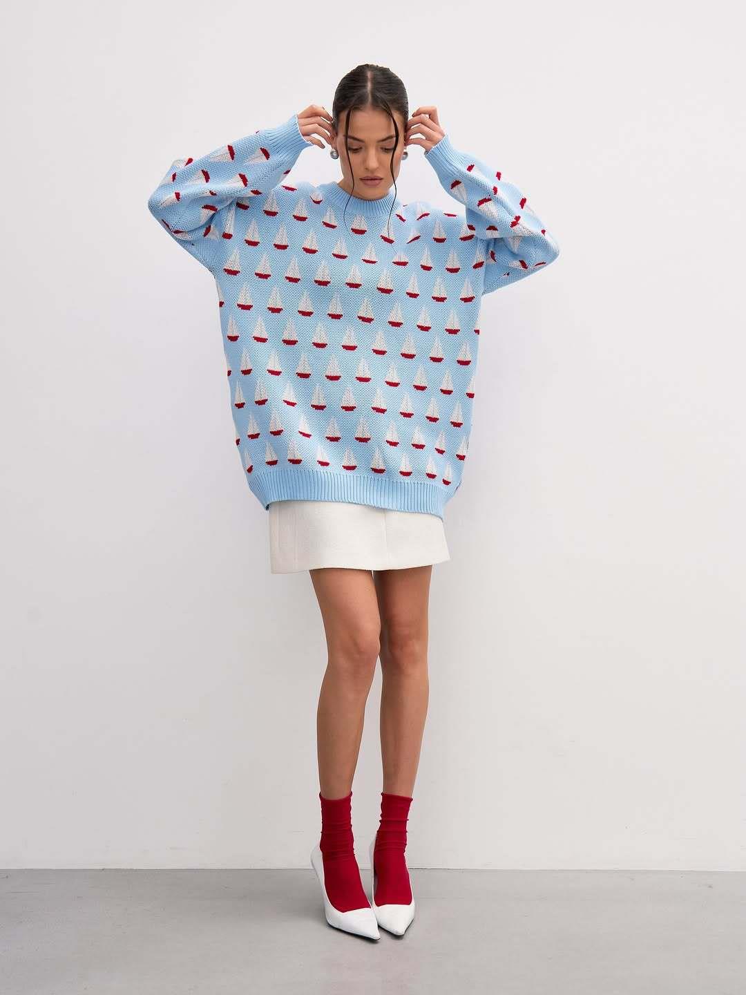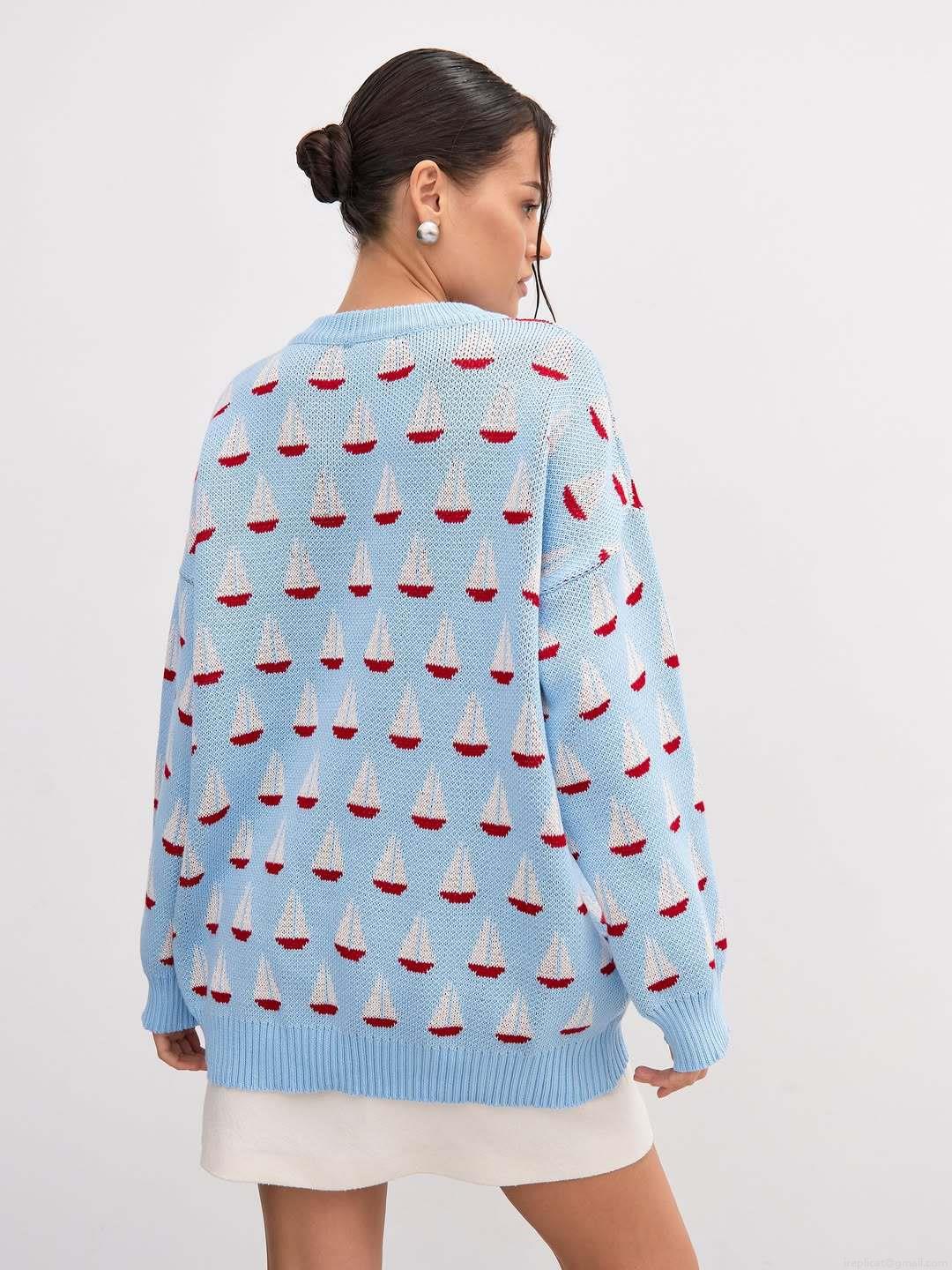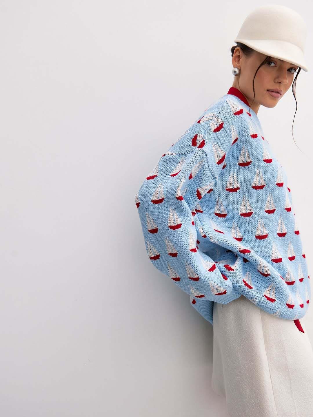 Women's Sailboat Pattern Jacquard Knitted Sweater Casual Loose Round Neck Long Sleeve Pullover Cotton Blend Autumn Winter Fashion Jumper Tops