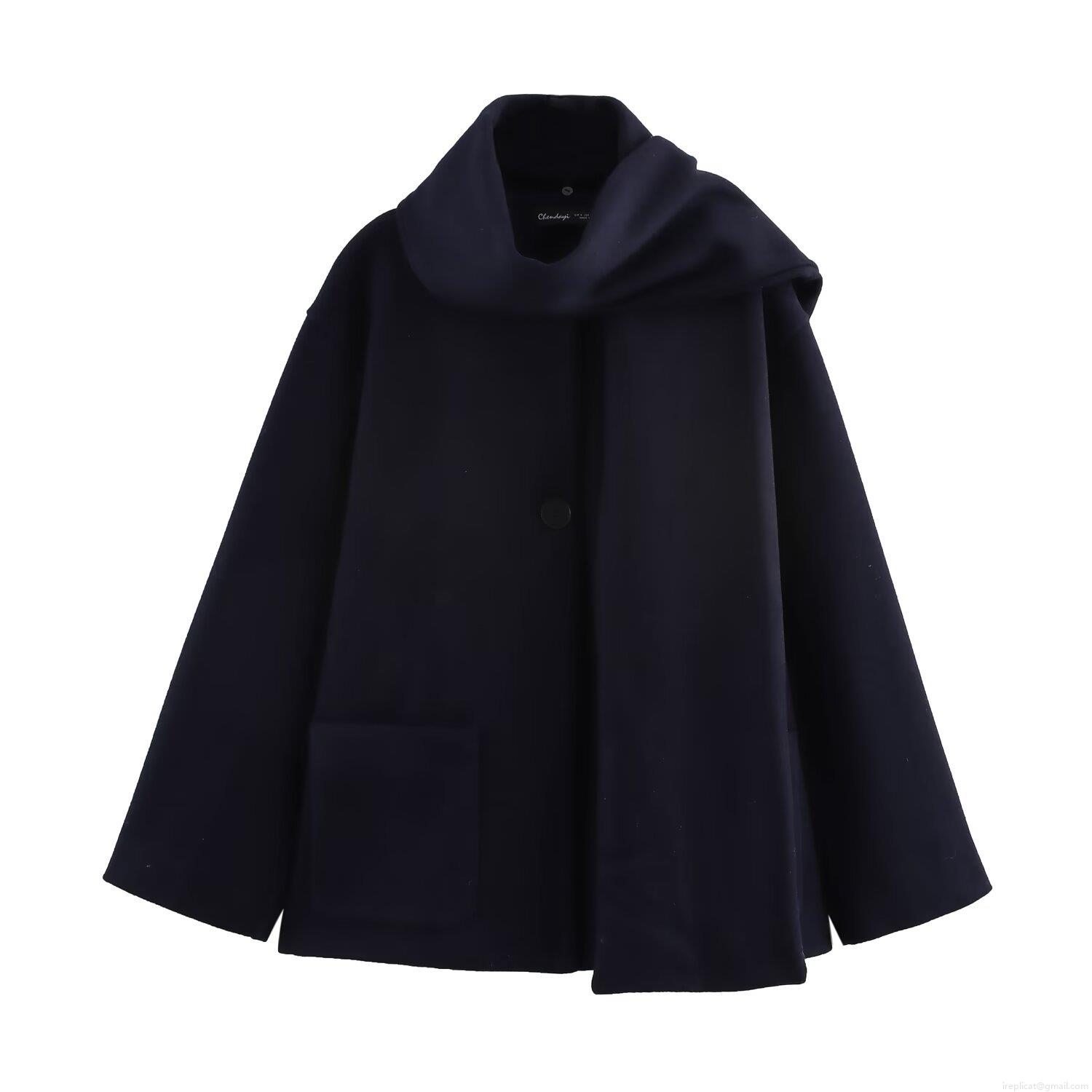 Women's Scarf Collar Woolen Coat Solid Color Long Sleeve Jacket With Big Pockets Fashion Outerwear For Fall Winter Street Style
