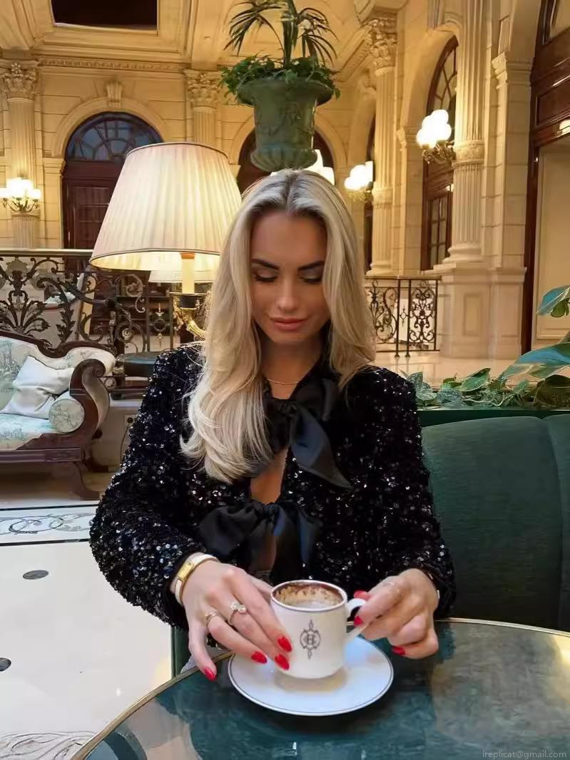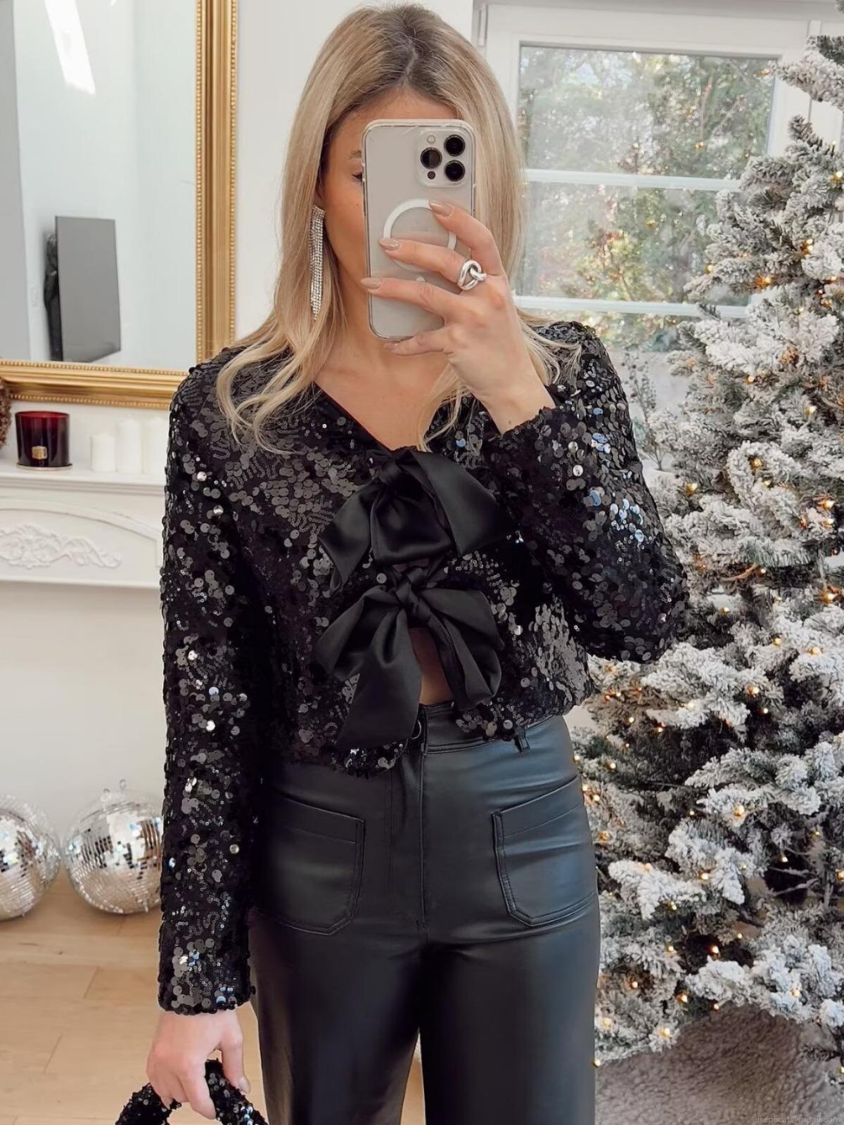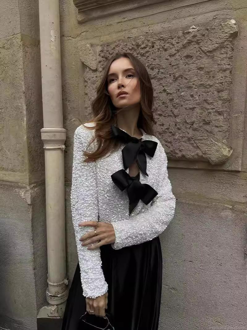 Women's Sequin Jacket Long Sleeve Elegant Sparkly Outwear with Large Bow Decor Fashion Short Round Neck Jacket for Party Evening Night Club