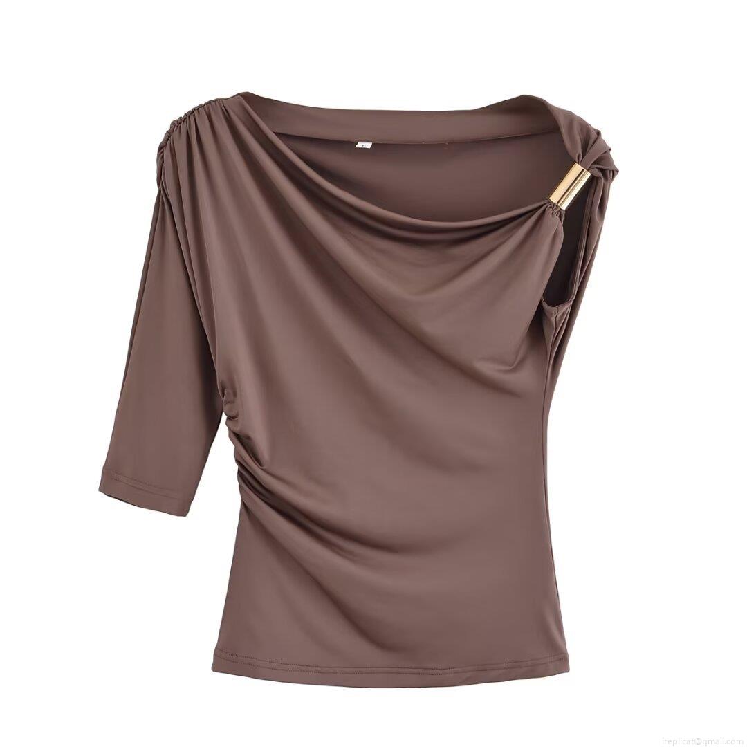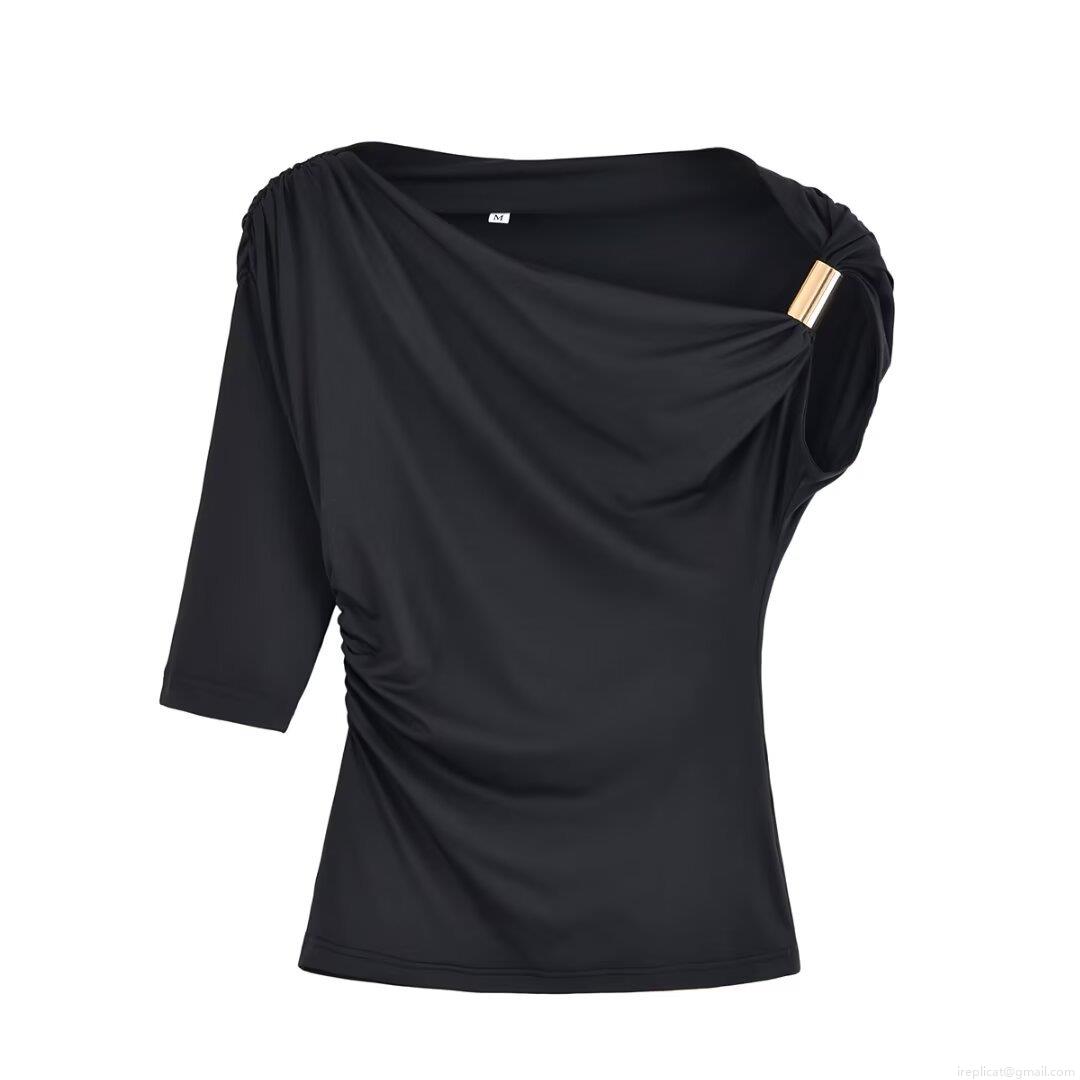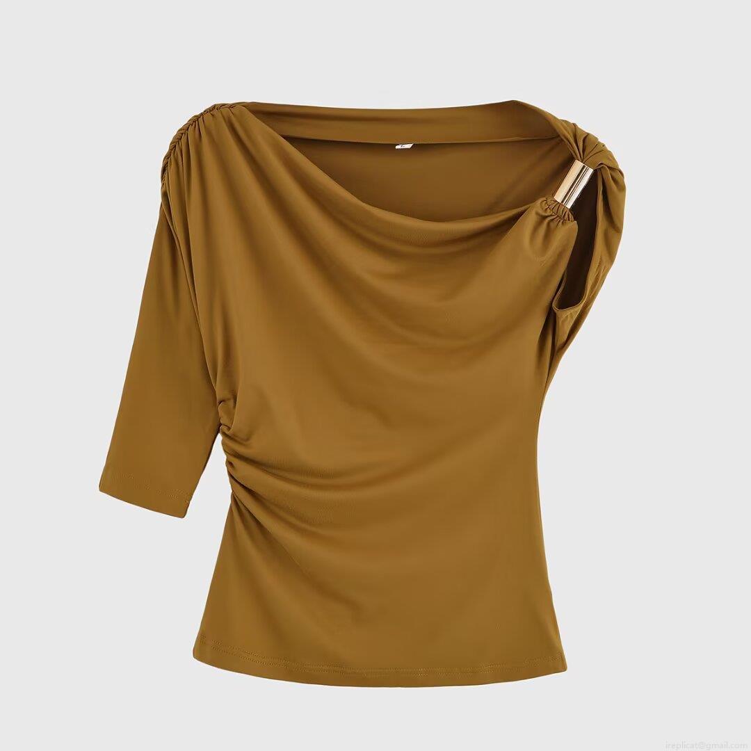Women's Sexy Asymmetric Ruched Top One Shoulder Long Sleeve Tee With Metal Ring Detail Solid Color Polyester Casual Slim Fit Shirt