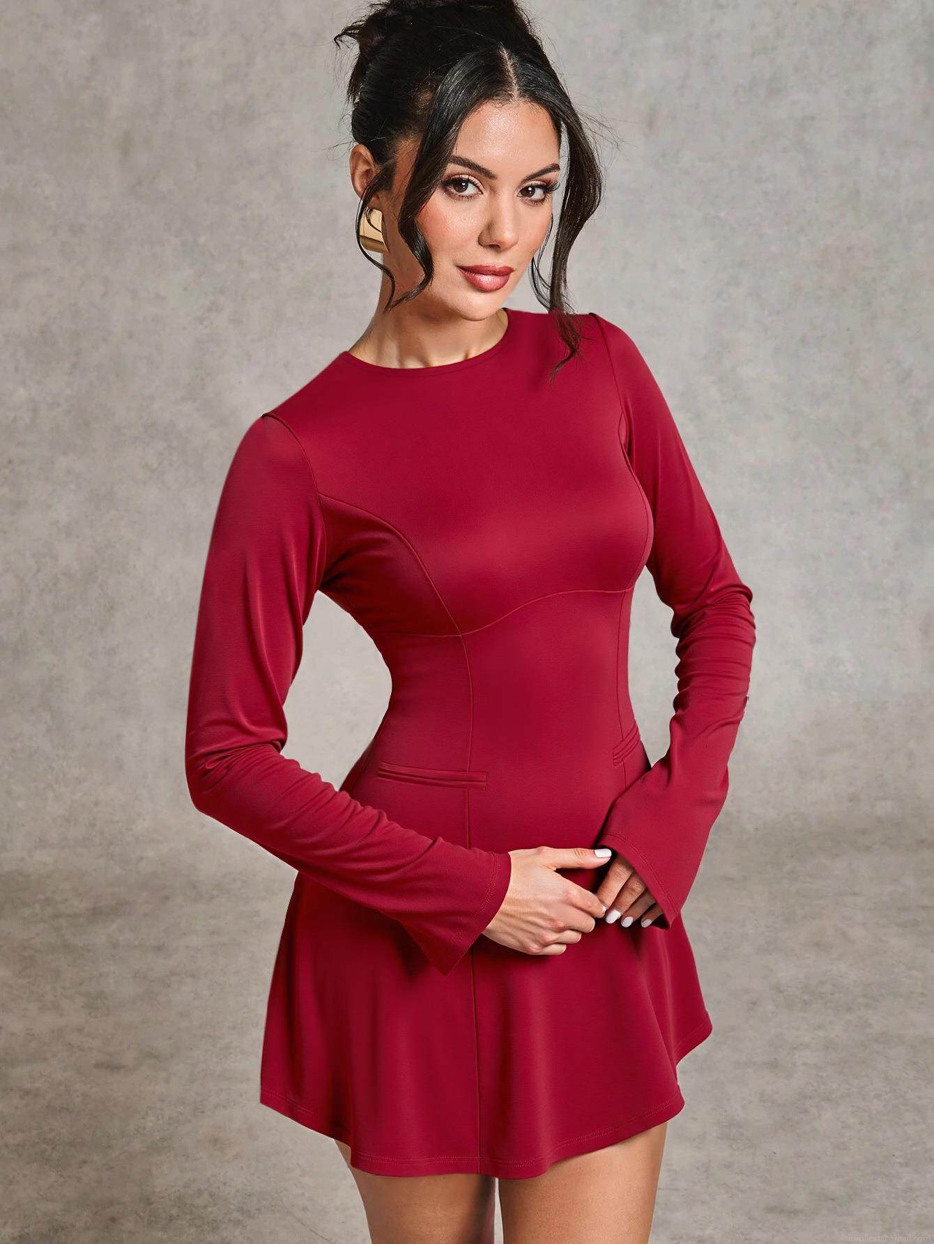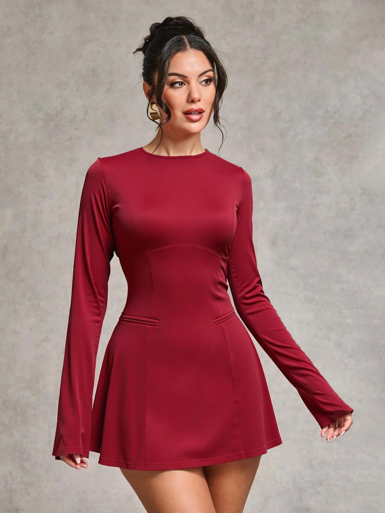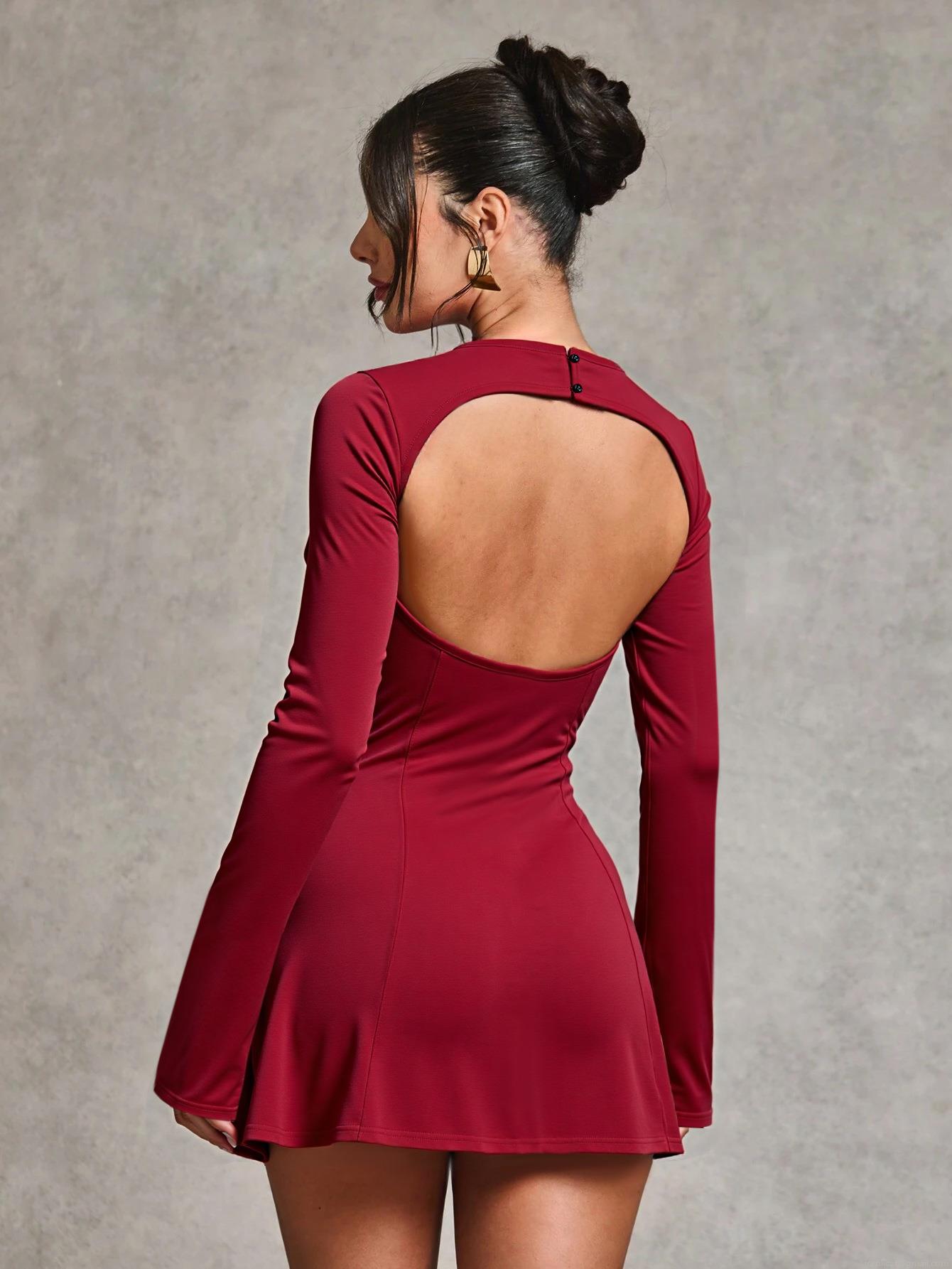 Women's Sexy Backless Mini Dress Elegant Burgundy Long Sleeve Slim Fit Knitted Party Dress Polyester Elastane Round Neck Solid Color Short A-Line Dress for Date Night Evening Clubwear