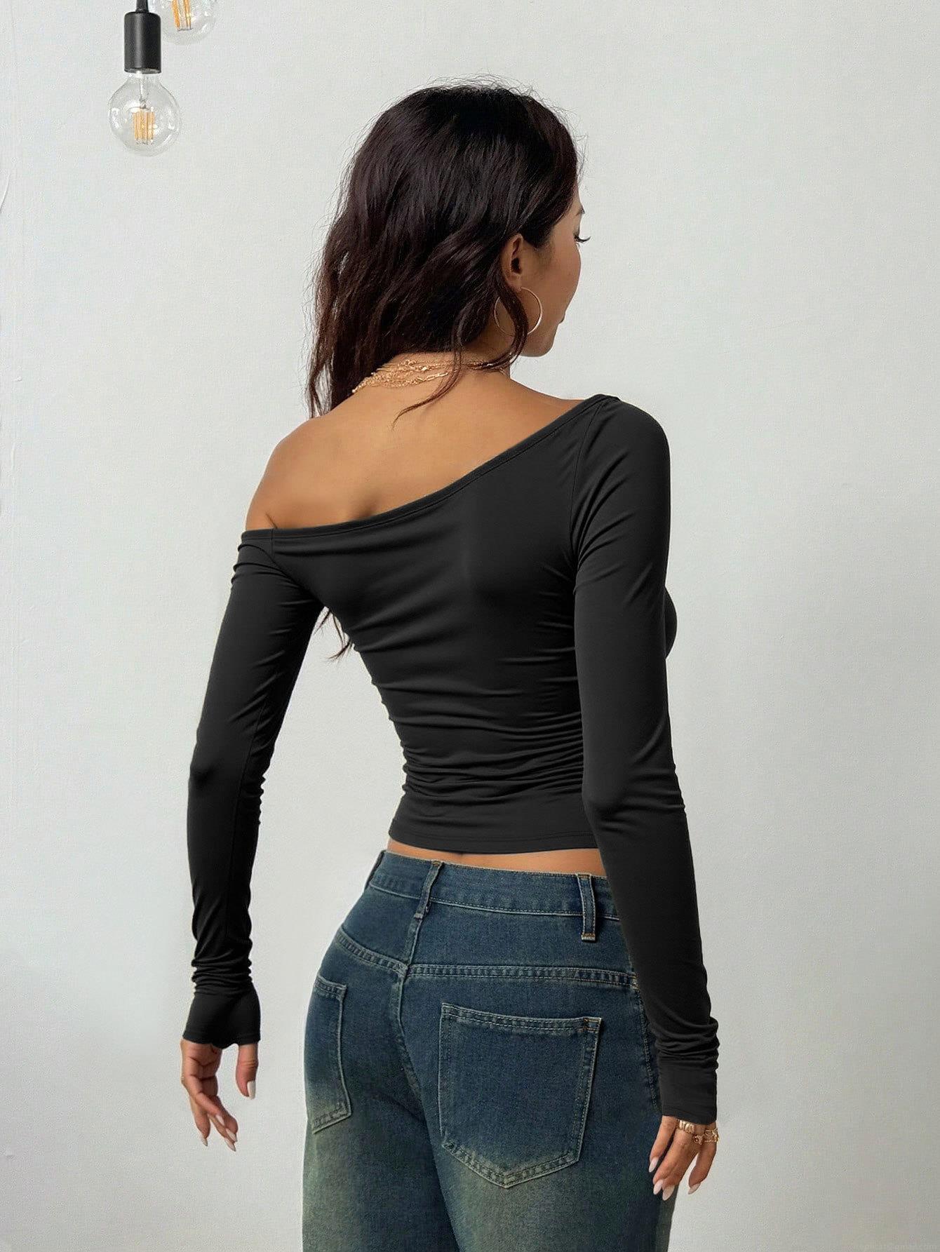 Women's Sexy Asymmetric Ruched Top One Shoulder Long Sleeve Tee With...