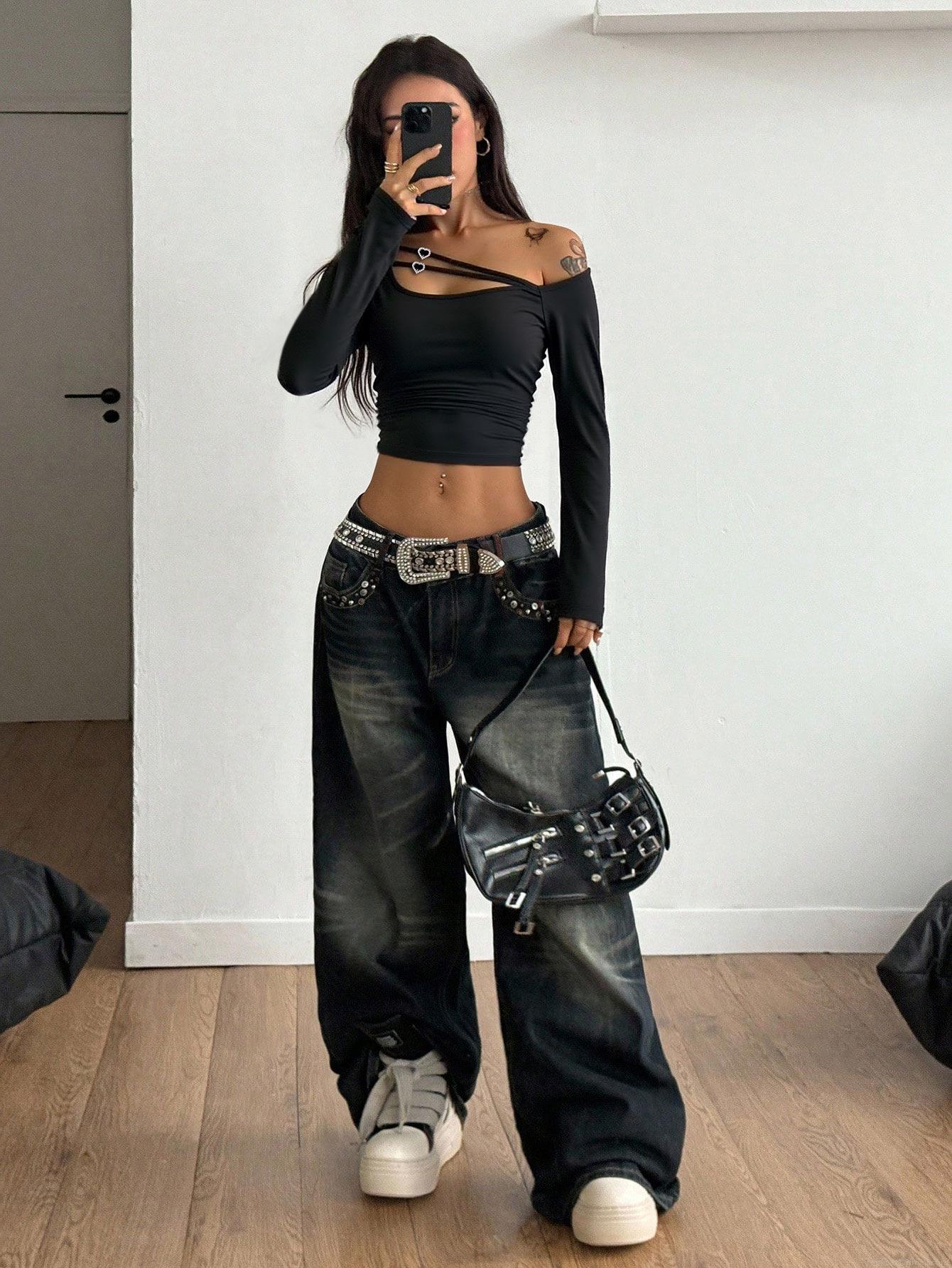 Women's Sexy Black Long Sleeve Cropped Top With Asymmetric Cutout Heart Rhinestone Buckle Slim Fit Polyester Elastane T-Shirt Streetwear