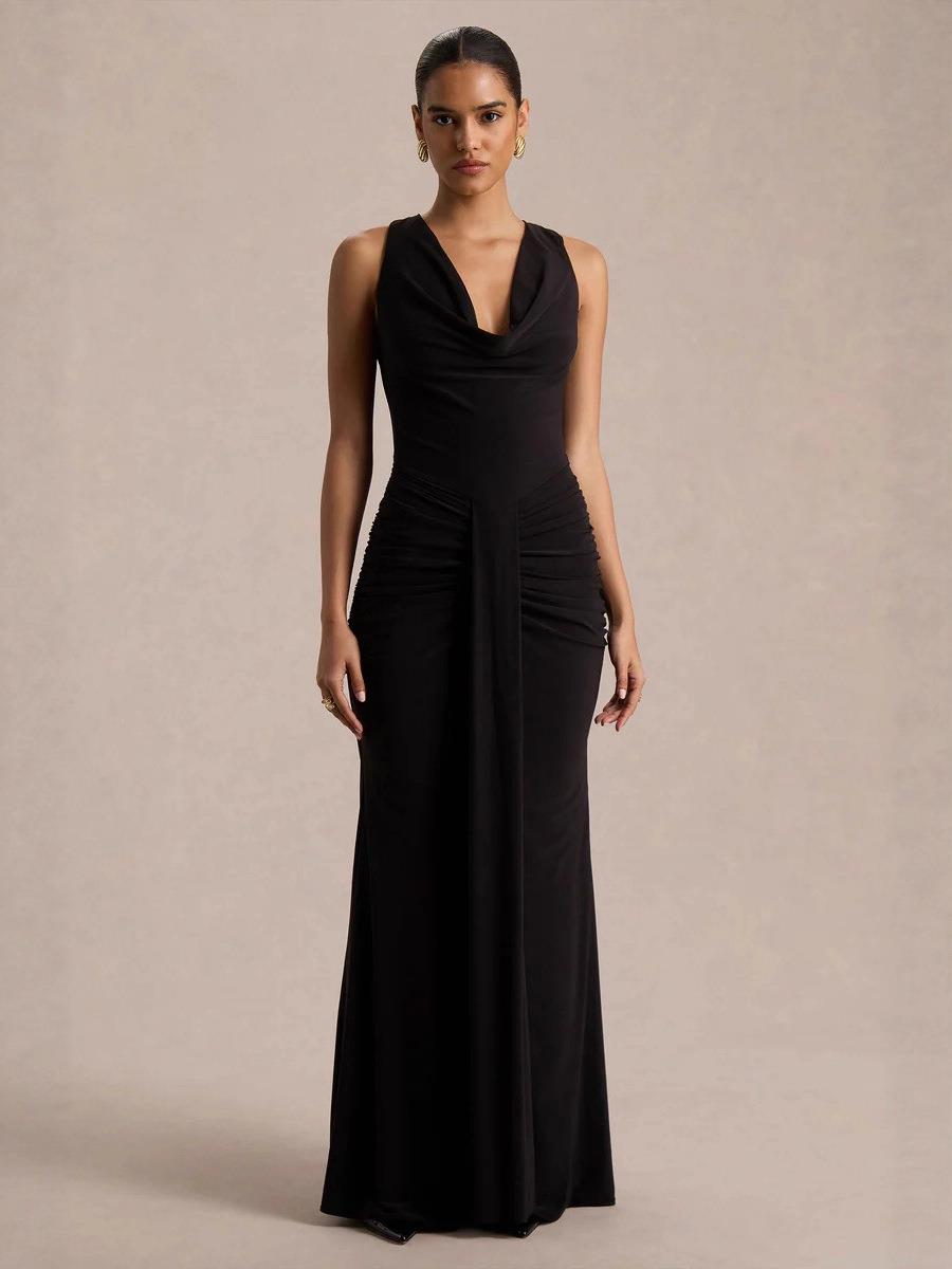 Women's Sexy Cowl Neck Ruched Evening Dress Sleeveless High Waist Slim Fit Solid Color Maxi Party Gown for Banquet Wedding