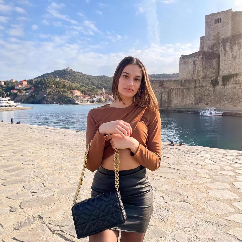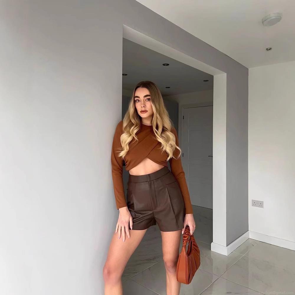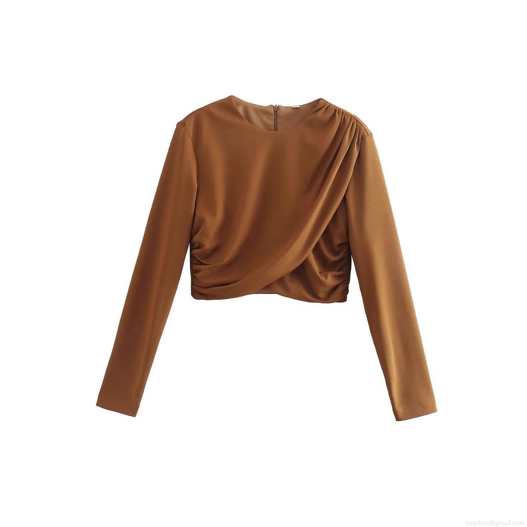Women's Sexy Deep Brown Long Sleeve Crop Top Round Neck Twisted Front Cross Wrap Pleated Slim Fit T-Shirt Polyester Spandex Streetwear Blouse With Back Zipper