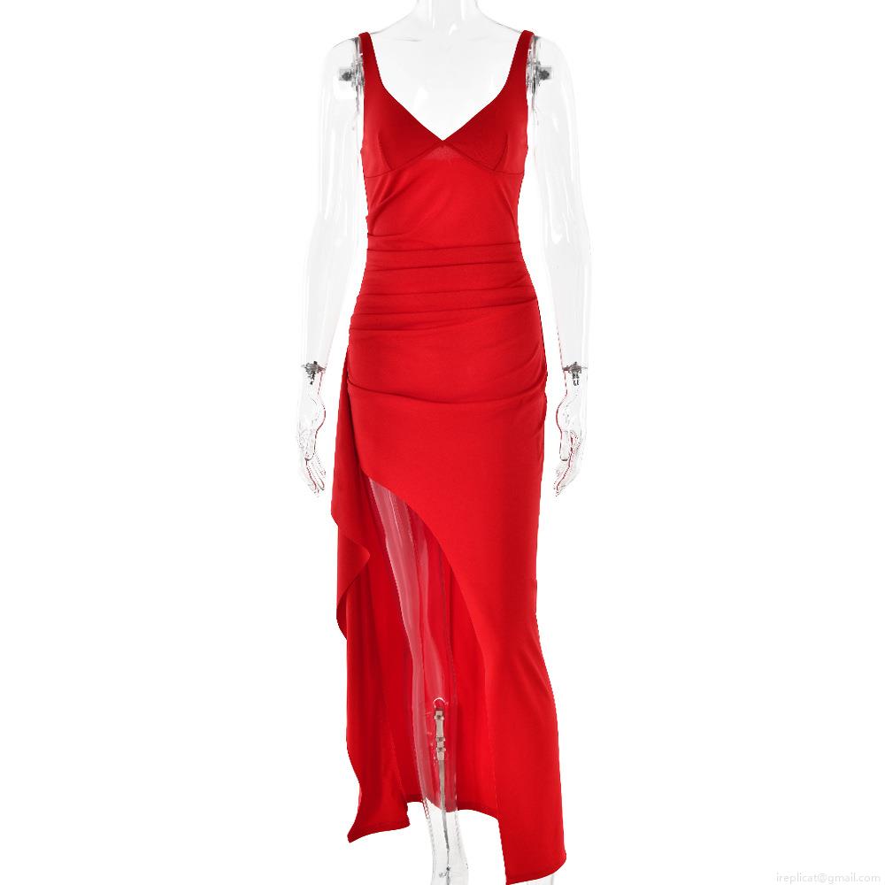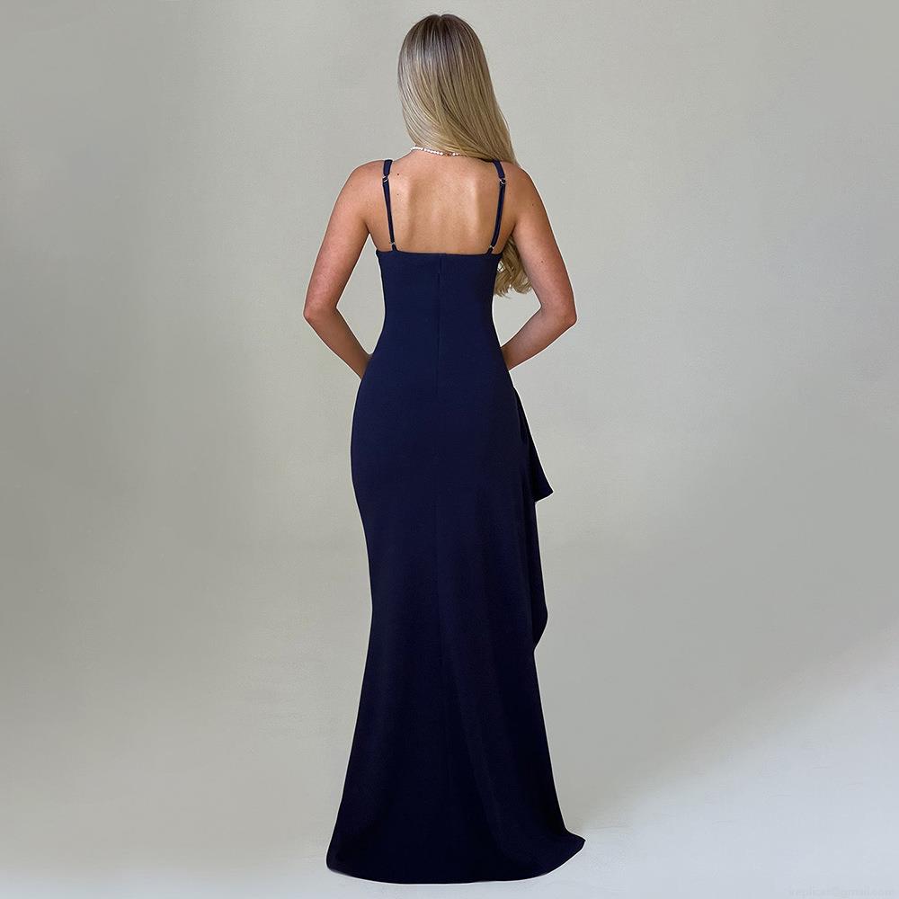Solid Color, Pleats, Ruffles, V-neck, Backless, Side Fork