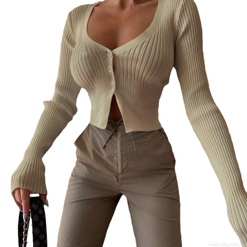 Women's Sexy Deep V Neck Rib-Knit Cardigan Long Sleeve Single Button Slim Fit Cropped Top Streetwear Autumn Fashion Knitted Sweater