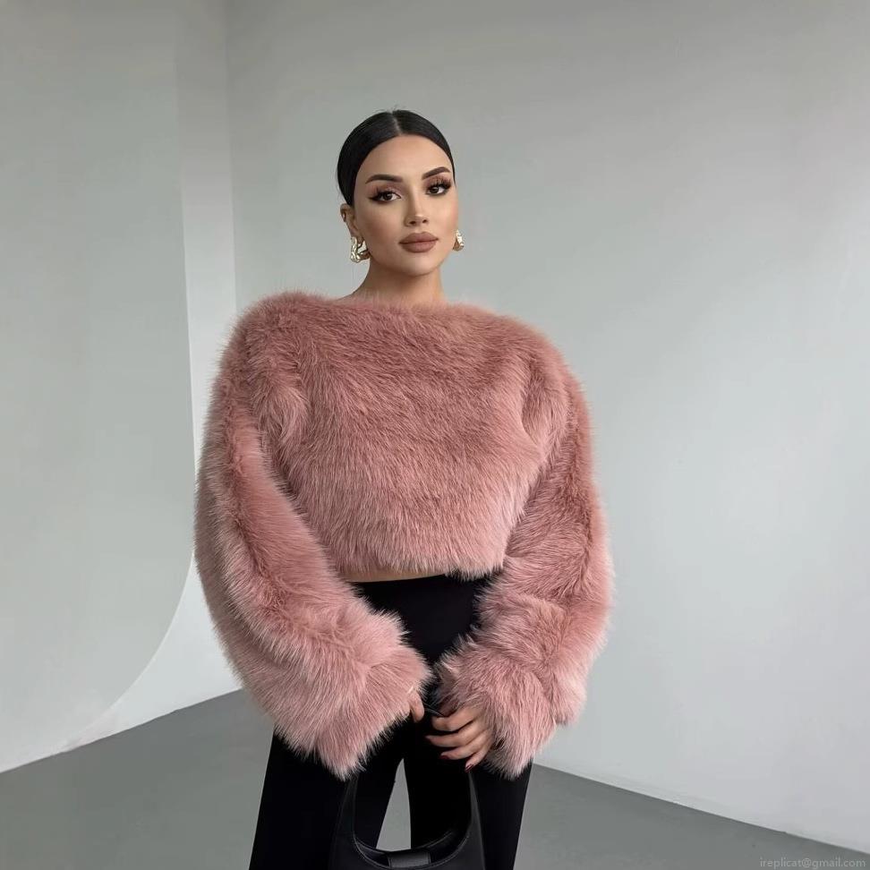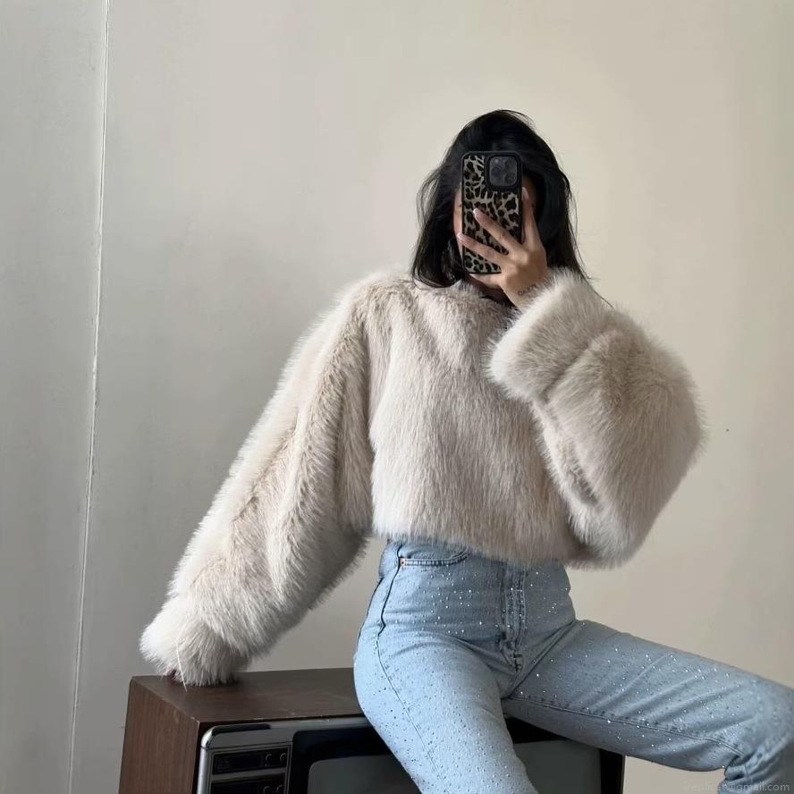 Women's Sexy Faux Fur Cropped Top Loose Round Neck Long Sleeve Plush Shirt Streetwear Winter Warm Shaggy Sweater For Ladies Solid Color Soft Fuzzy Texture