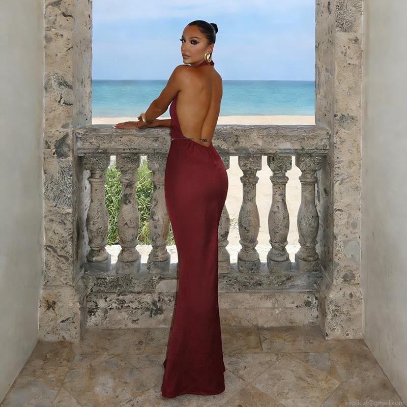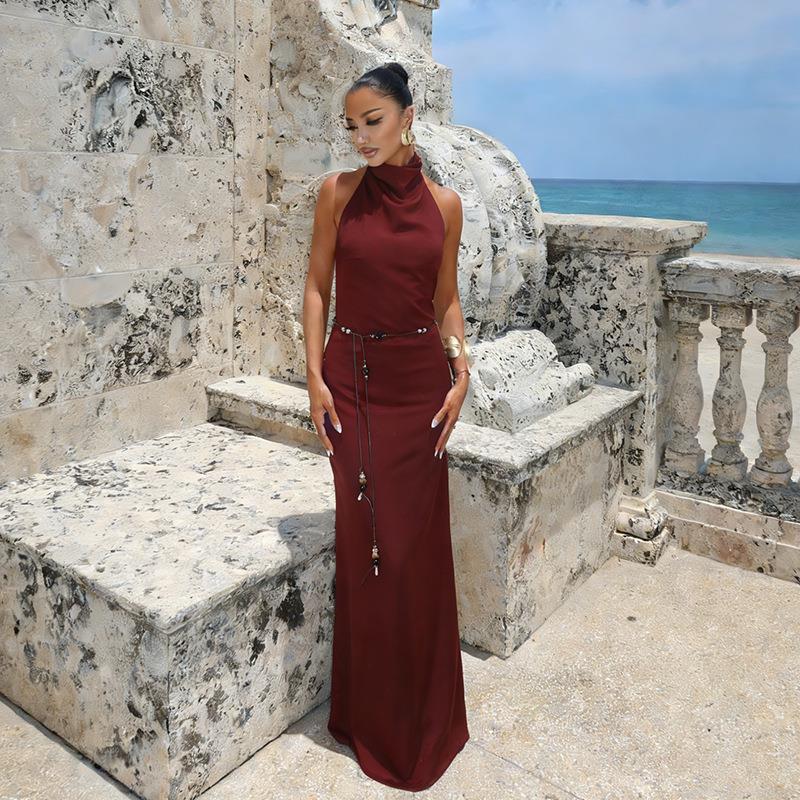 Solid Color, Neckband, Backless, Satin Texture, Slimming And Waist-cinching, Long Floor Mop