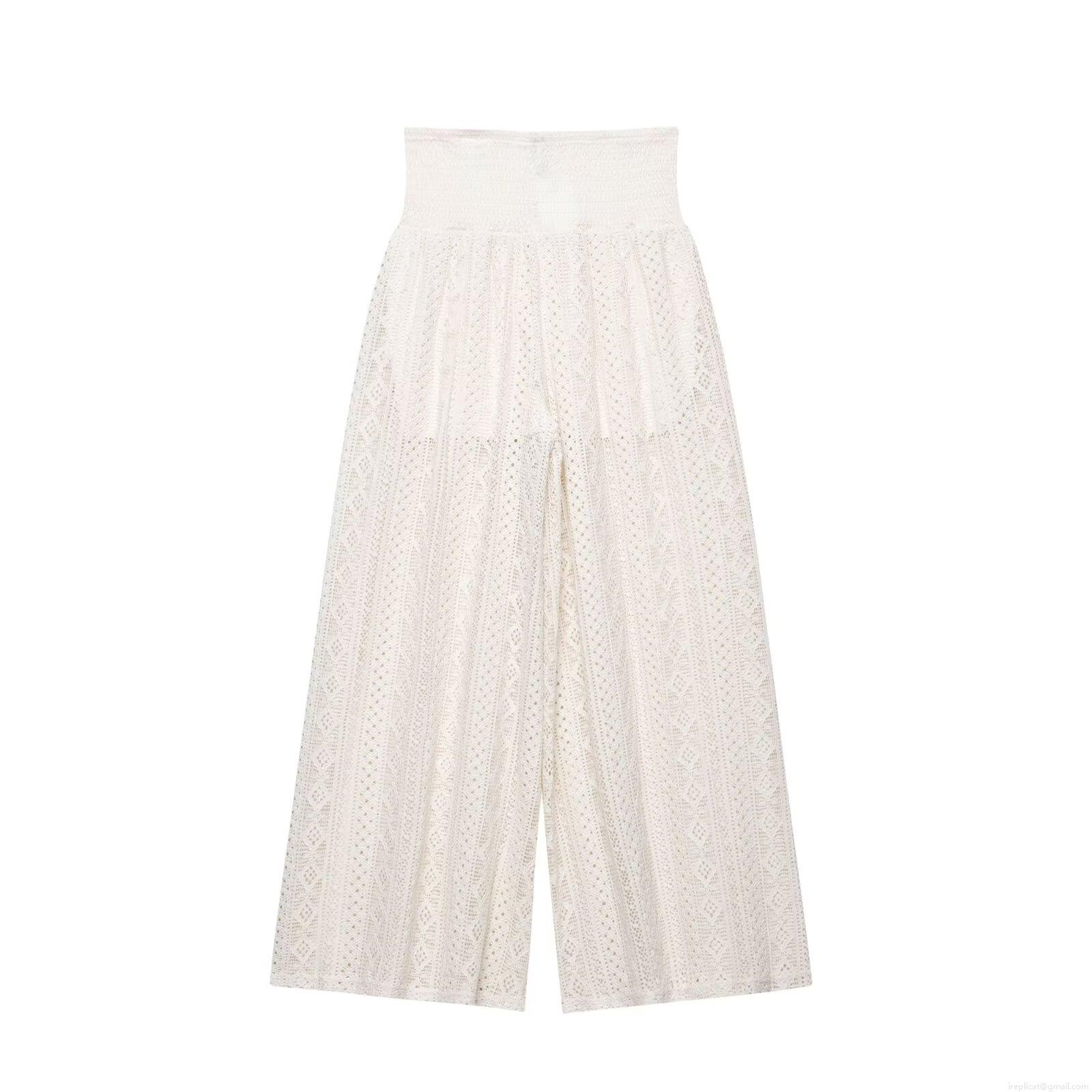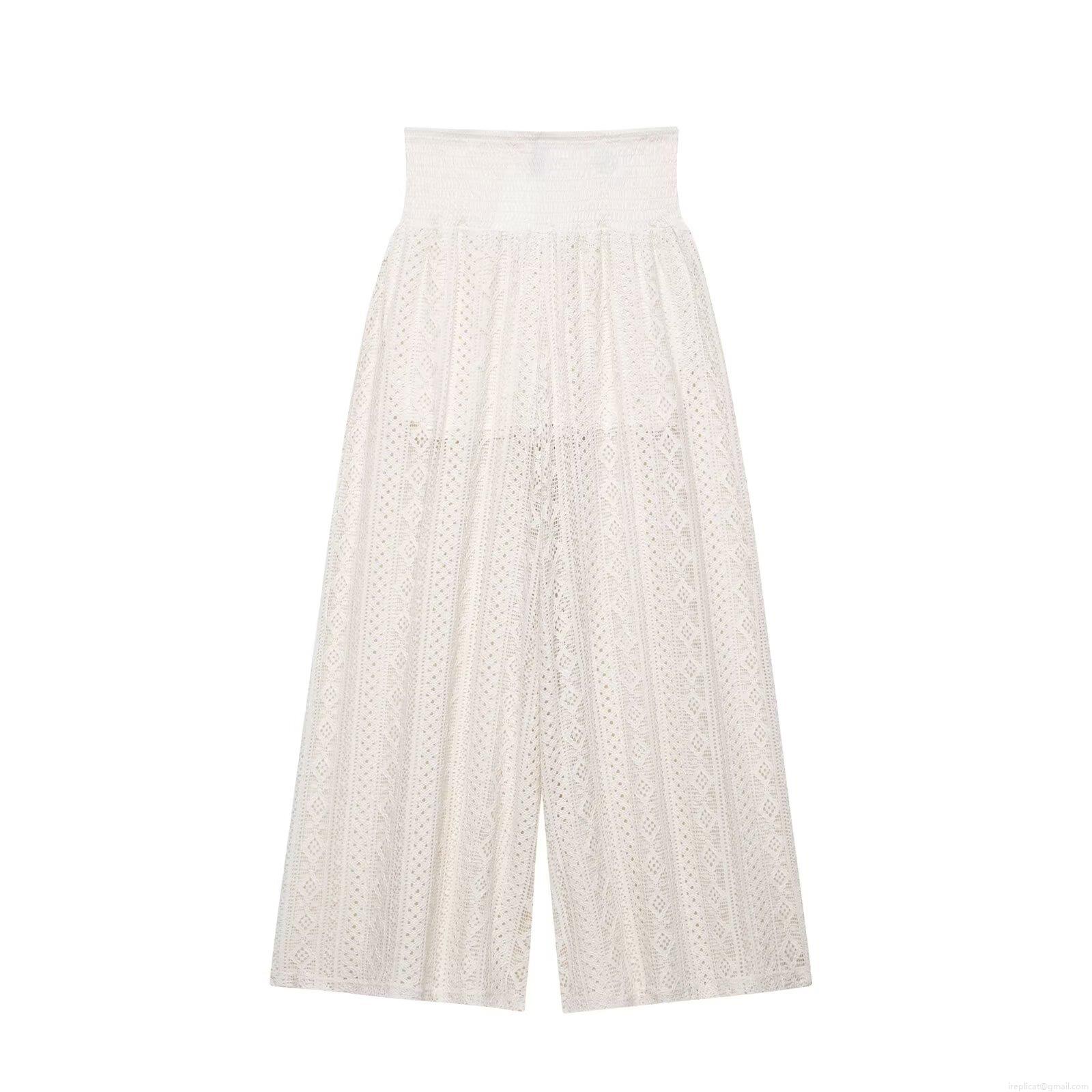 Women's Sexy Hollow Out Lace Wide Leg Pants High Waist Elastic Waist Sheer Crochet Long Trousers With Lining Casual Beach Vacation Streetwear