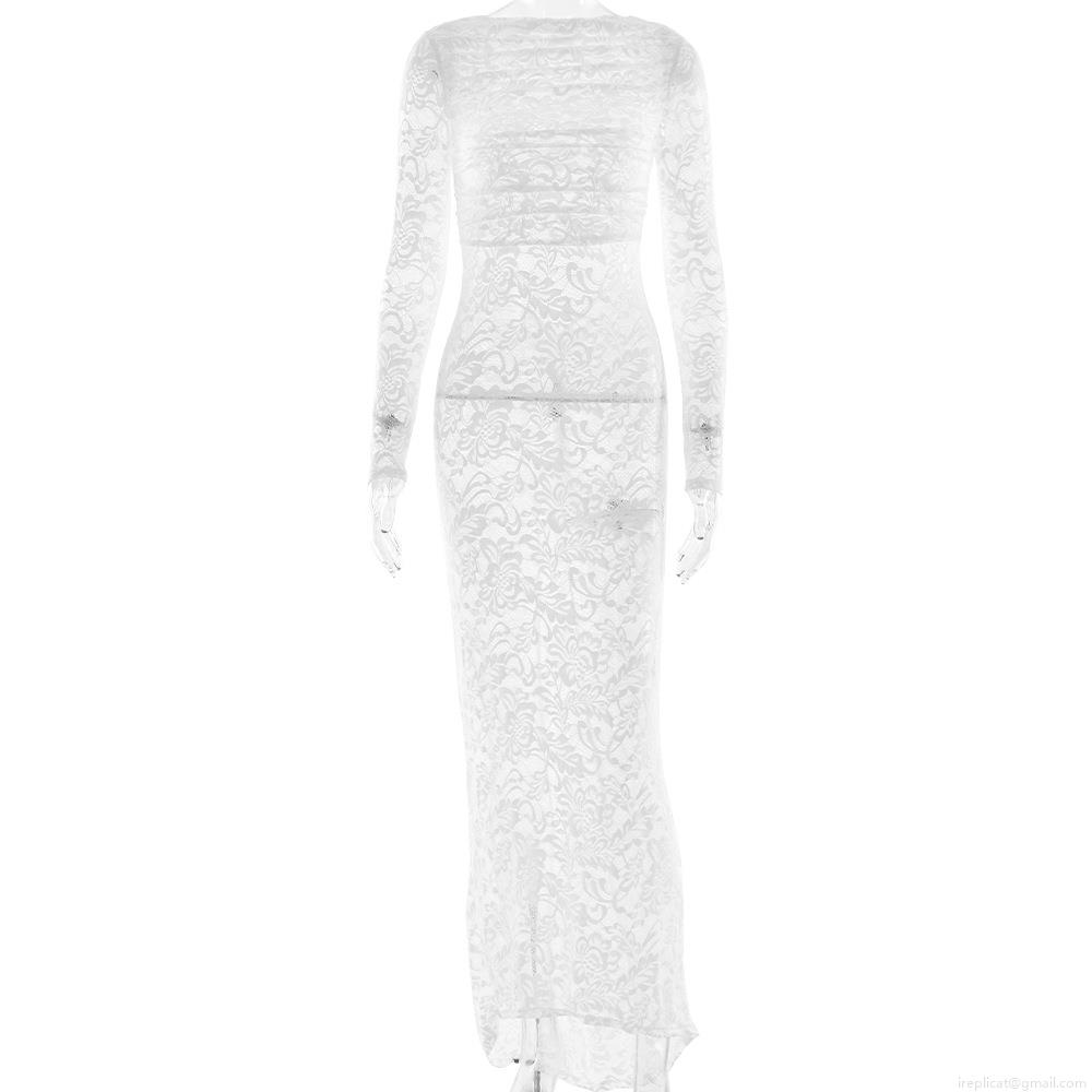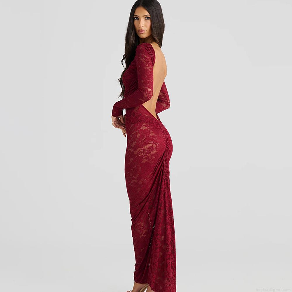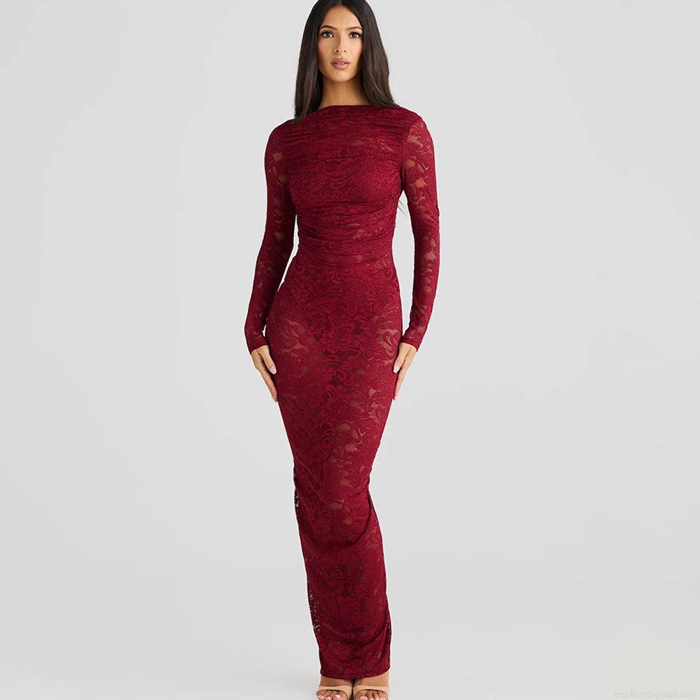 Women's Sexy Lace Backless Maxi Dress Long Sleeve See Through Bodycon Party Evening Gown With Floral Pattern For Wedding Party Women Clothing