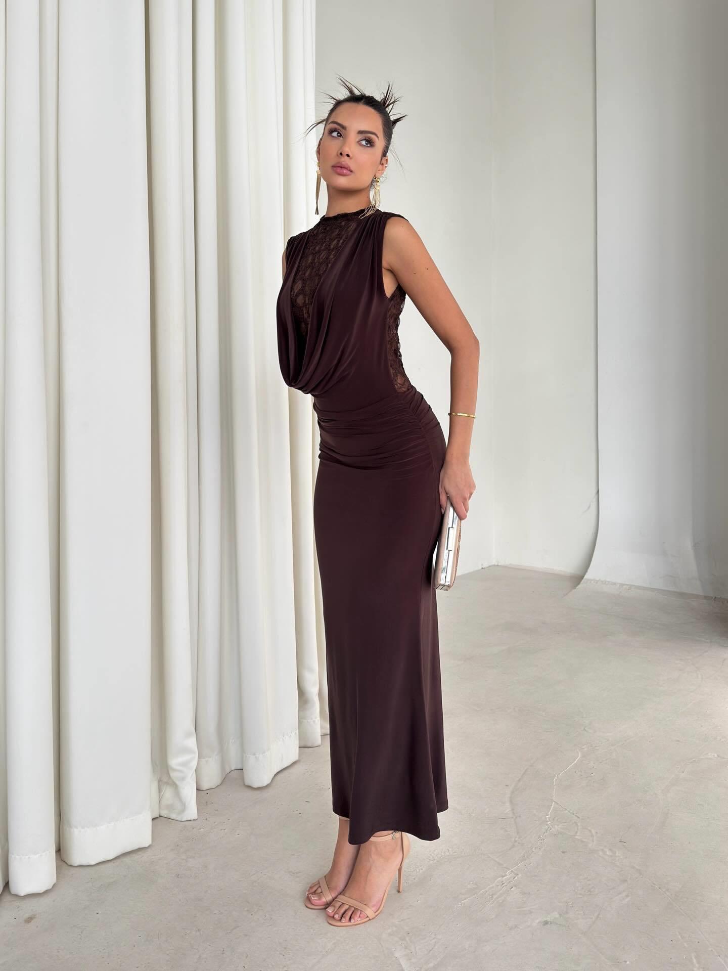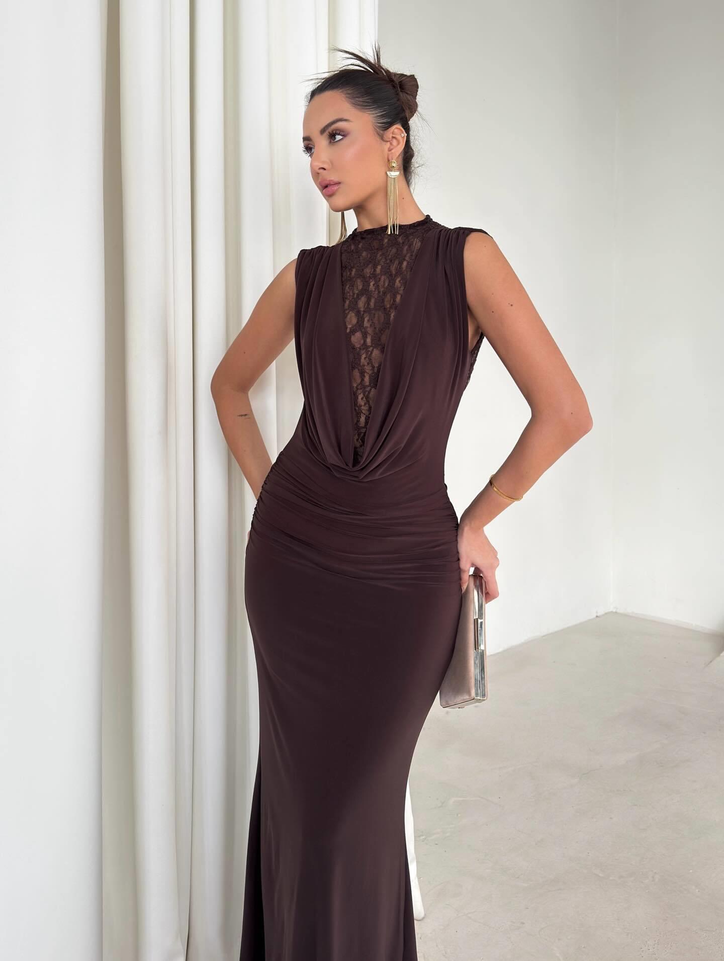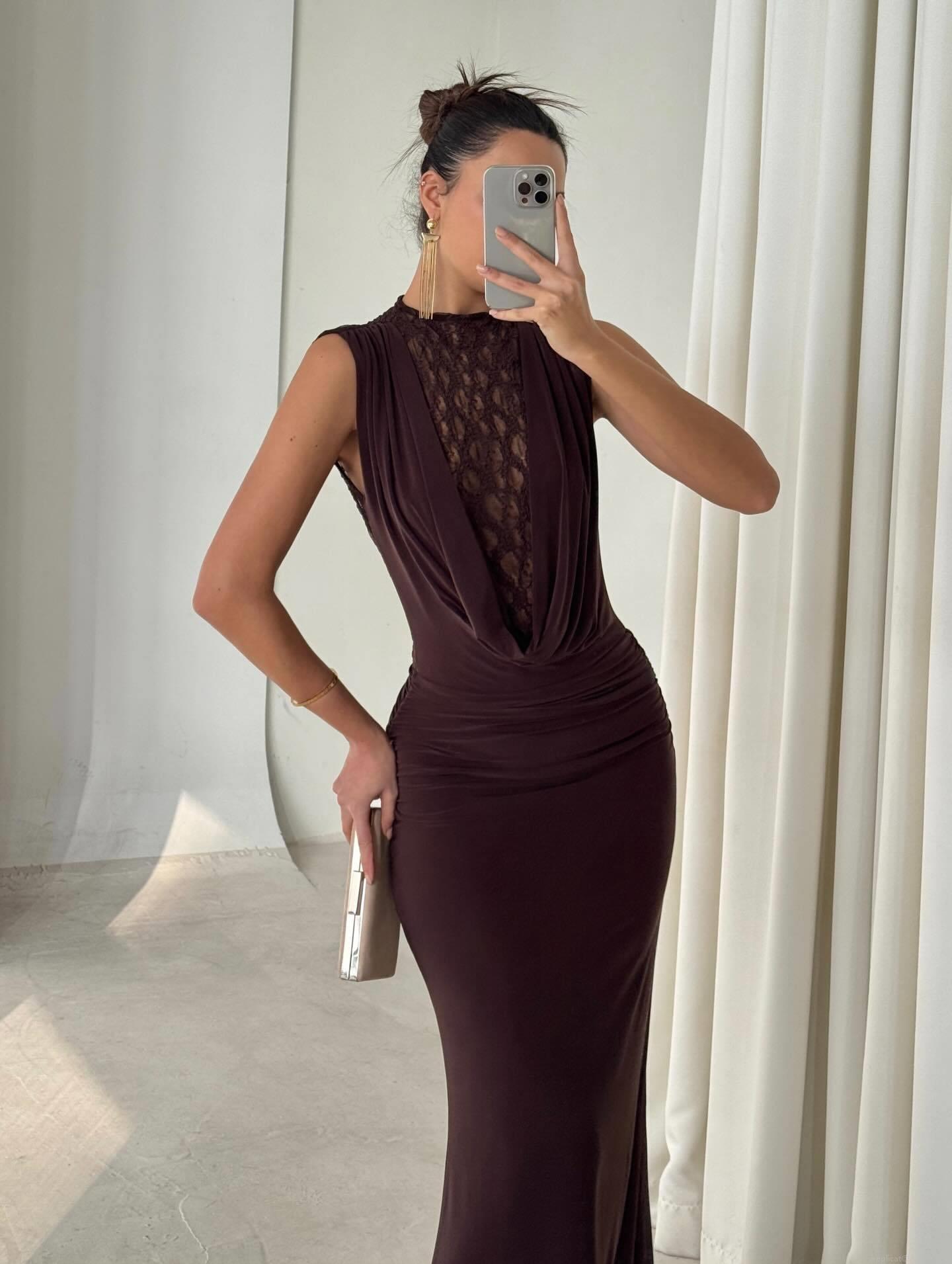 Women's Sexy Lace Patchwork Sleeveless Maxi Dress Slim Fit Backless Bodycon Evening Gown For Party Banquet Deep Brown Elegant Floor Length Clubwear Dress