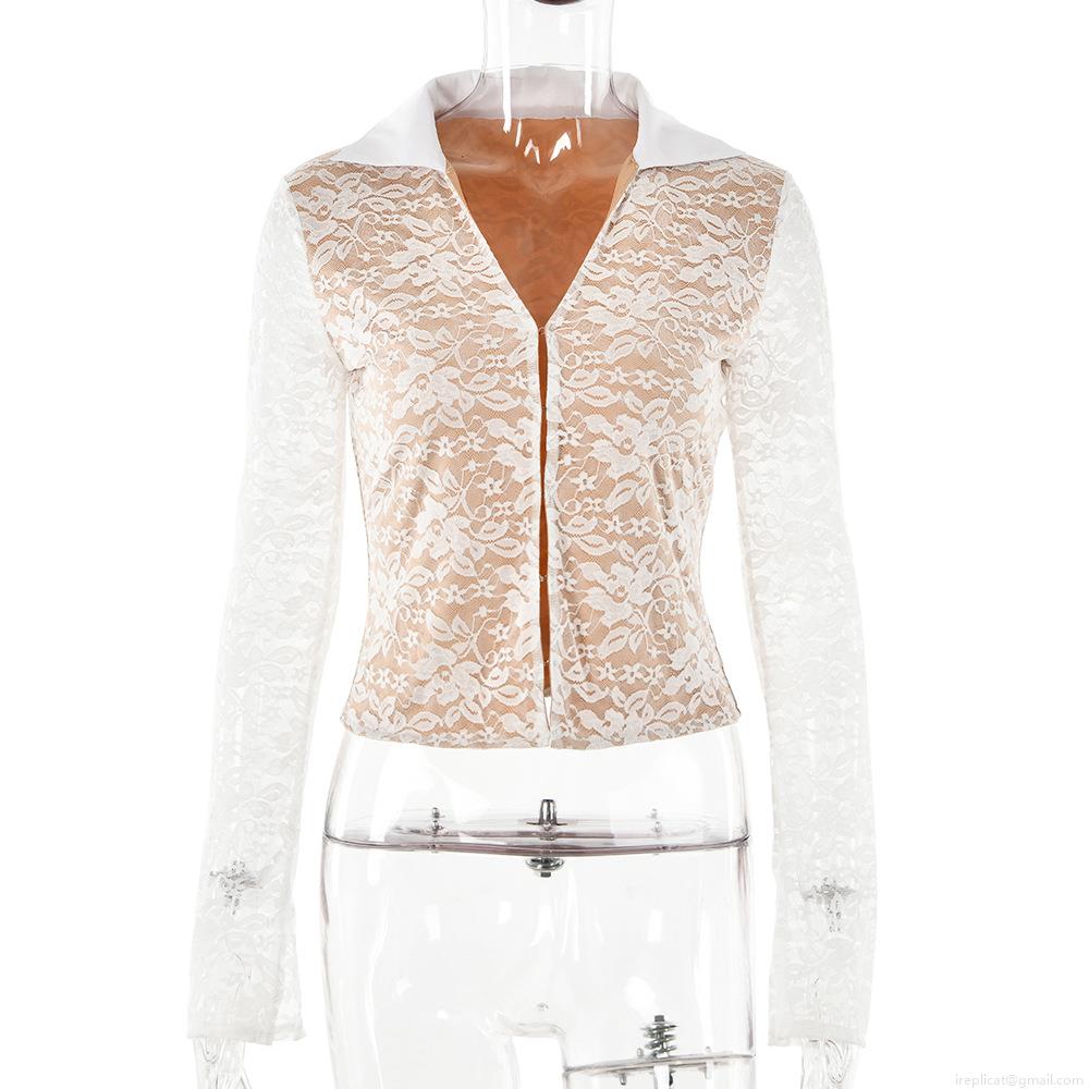 Women's Sexy Lace Stitching Long Flared Sleeve T-Shirt POLO Collar V-Neck Slim Fit Crop Top With Nude Lining Hand-Sewn Hooks Cardigan For Party Club Night Out Streetwear
