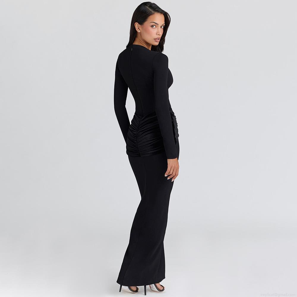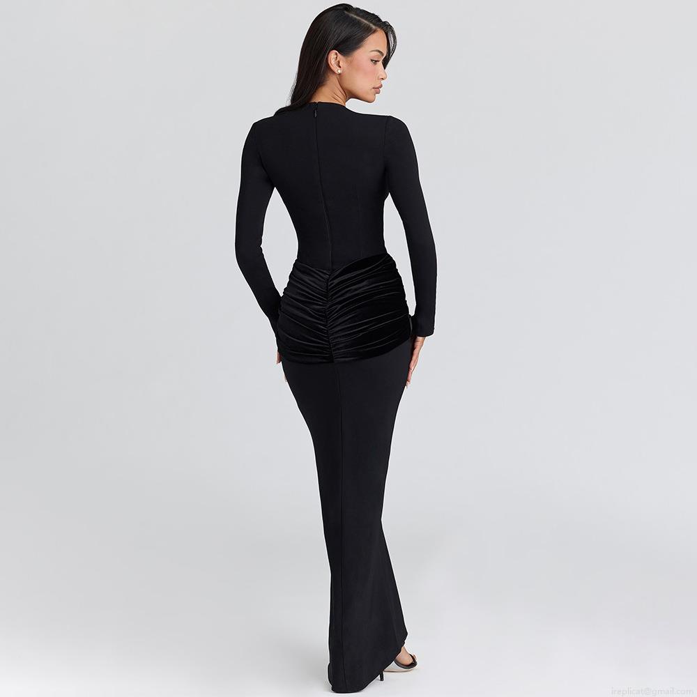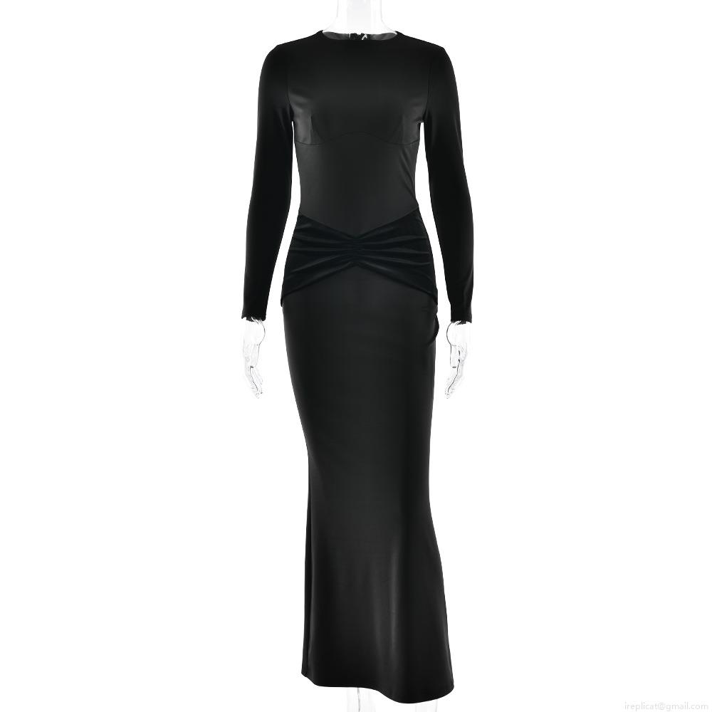 Women's Sexy Long Sleeve Bodycon Evening Dress Polyester Gabardine Korean Velvet Patchwork Slim Fit Waist-cinched Pleated Maxi Dress For Party Formal Wedding Guest