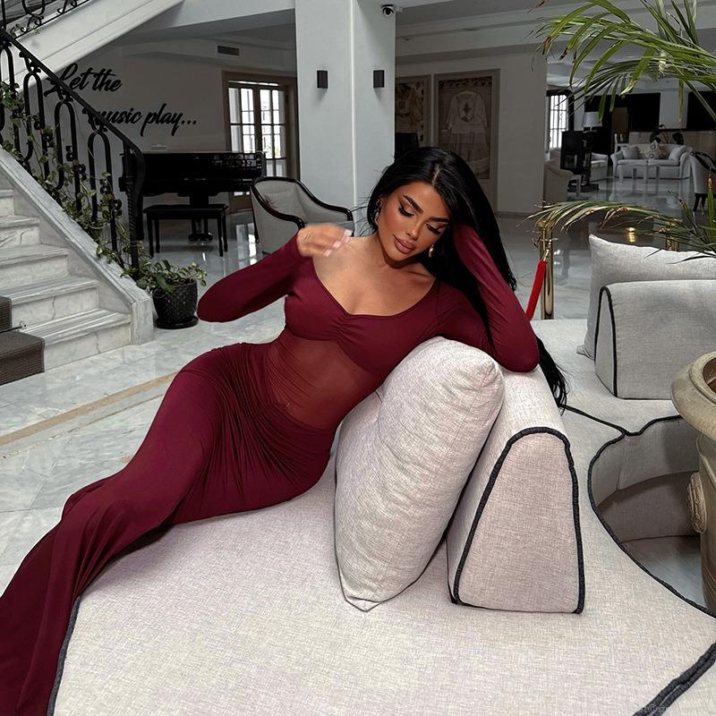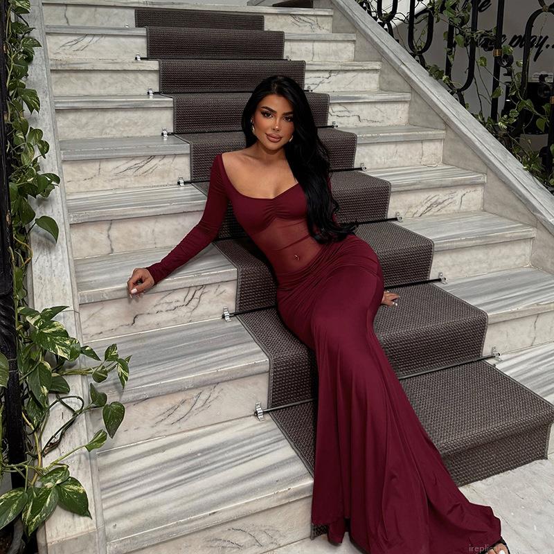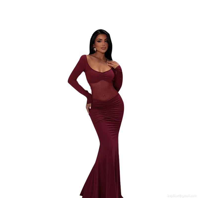 Women's Sexy Long Sleeve Evening Maxi Dress Sheer Mesh Patchwork Slim Fit Ruched Mermaid Gown For Wedding Party Elegant Burgundy Dress
