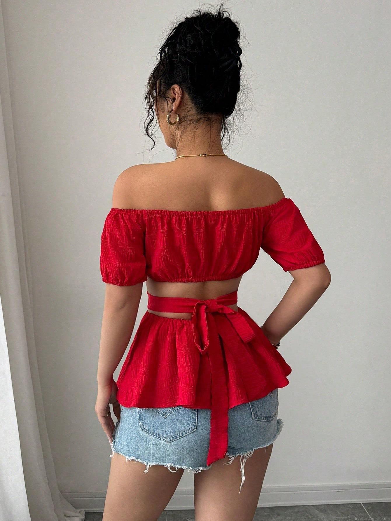 Women's Sexy Off-Shoulder T-Shirt Polyester Elastane Short Puff Sleeve Cut Out Waist Smocked Texture Back Tie Ruffle Hem Top For Summer Vacation Party